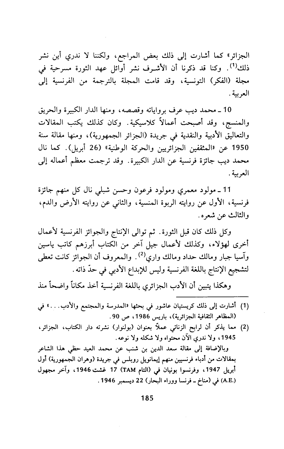 وكل ذلك كان قبل الثورة. ثم توالى الإنتاج والجوائز الفرنسية لأعمال أخرى لهؤلاء، وكذلك لأعمال جيل آخر من الكتاب أبرزهم كاتب ياسين وآسيا جبار ومالك حداد ومالك واري (¬2). والمعروف أن الجوائز كانت تعطى لتشجيع الإنتاج باللغة الفرنسية وليس لإبداع الأدبي في حد ذاته.