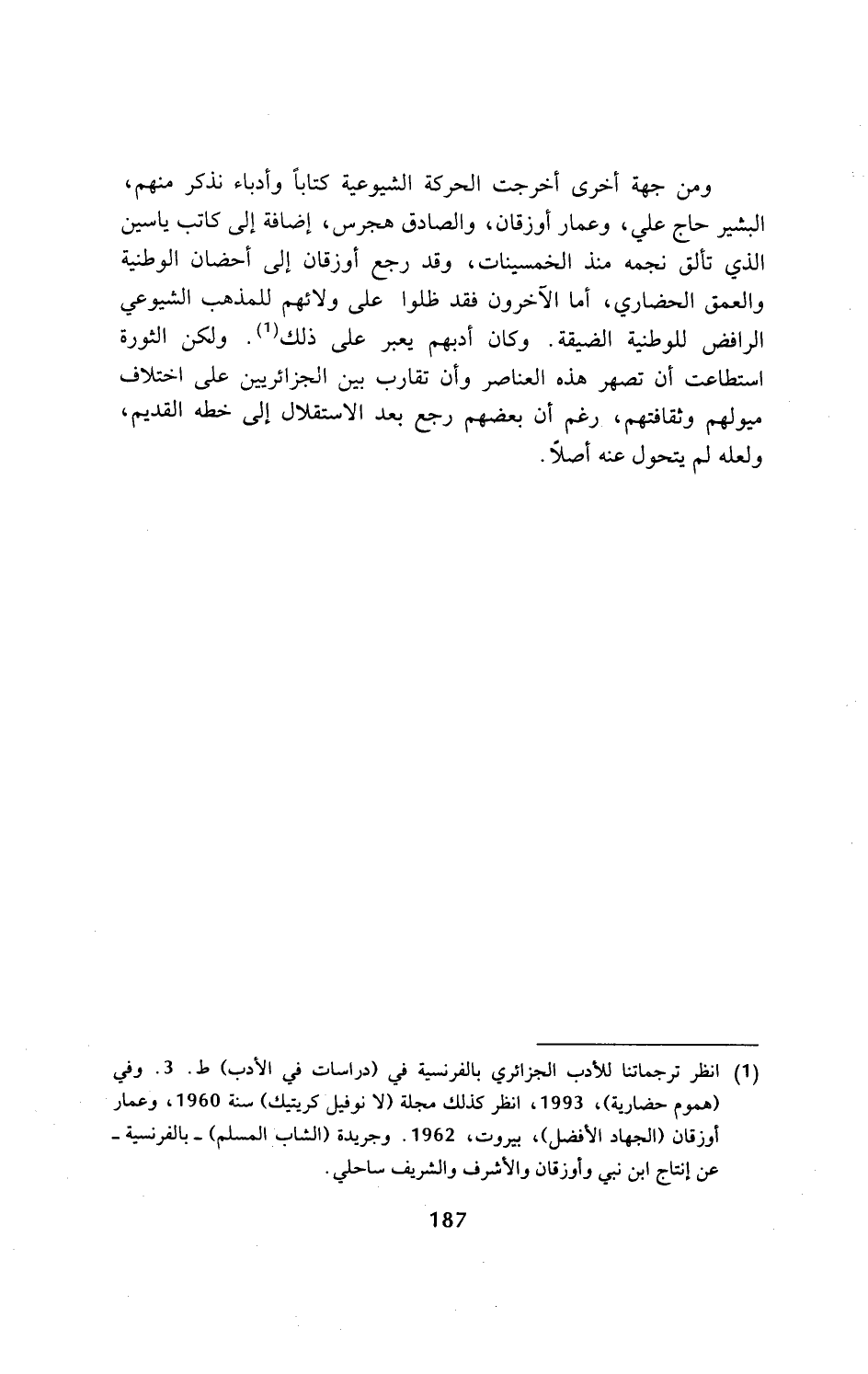 (¬1) انظر ترجماتنا للأدب الجزائري بالفرنسية في (دراسات في الأدب) ط. 3. وفي (هموم حضارية)، 1993، انظر كذلك مجلة (لا نوفيل كريتيك) سنة 1960، وعمار أوزقان (الجهاد الأفضل)، بيروت، 1962. وجريدة (الشاب المسلم) - بالفرنسية - عن إنتاج ابن نبي وأوزقان والأشرف والشريف ساحلى.