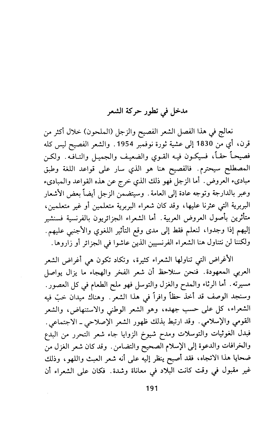 نعالج في هذا الفصل الشعر الفصيح والزجل (الملحون) خلال أكثر من قرن، أي من 1830 إلى عشية ثورة نوفمبر 1954. والشعر الفصيح ليس كله فصيحا حقا، فسيكون فيه القوي والضعيف والجميل والتافه. ولكن المصطلح سيحترم. فالفصيح هنا هو الذي سار على قواعد اللغة وطبق مبادئ العروض. أما الزجل فهو ذلك الذي خرج عن هذه القواعد والمبادئ وعبر بالدارجة وتوجه عادة إلى العامة. وسيتضمن الزجل أيضا بعض الأشعار البربرية التي عثرنا عليها، وقد كان شعراء البربرية متعلمين أو غير متعلمين، متأثرين بأصول العروض العربية. أما الشعراء الجزائريون بالفرنسية فسنشير إليهم إذا وجدوا، لنعلم فقط إلى مدى وقع التأثير اللغوي والأجنبي عليهم. ولكننا لن نتناول هنا الشعراء الفرنسيين الذين عاشوا في الجزائر أو زاروها.