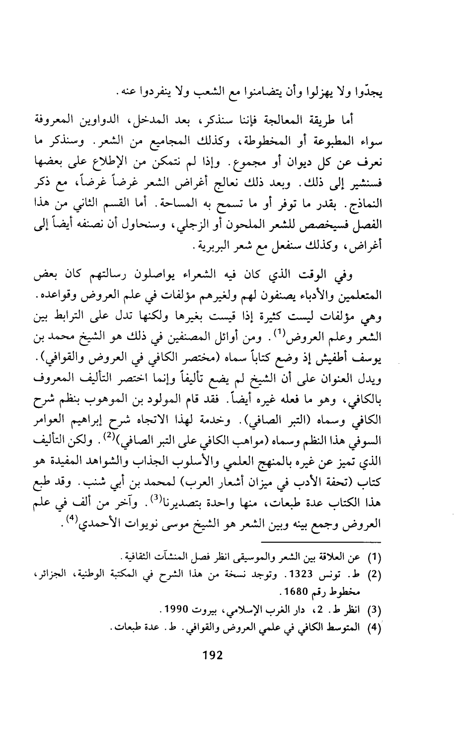 وفي الوقت الذي كان فيه الشعراء يواصلون رسالتهم كان بعض المتعلمين والأدباء يصنفون لهم ولغيرهم مؤلفات في علم العروض وقواعده. وهي مؤلفات ليست كثيرة إذا قيست بغيرها ولكنها تدل على الترابط بين الشعر وعلم العروض (¬1). ومن أوائل المصنفين في ذلك هو الشيخ محمد بن يوسف أطفيش إذ وضع كتابا سماه (مختصر الكافي في العروض والقوافي). ويدل العنوان على أن الشيخ لم يضع تا ليفا وإنما اختصر التأليف المعروف بالكافي، وهو ما فعله غيره أيضا. فقد قام المولود بن الموهوب بنظم شرح الكافي وسماه (التبر الصافي). وخدمة لهذا الاتجاه شرح إبراهيم العوامر السوفي هذا النظم وسماه (مواهب الكافي على التبر الصافي) (¬2). ولكن التأليف الذي تميز عن غيره بالمنهج العلمي والأسلوب الجذاب والشواهد المفيدة هو كتاب (تحفة الأدب في ميزان أشعار العرب) لمحمد بن أبي شنب. وقد طبع هذا الكتاب عدة طبعات، منها واحدة بتصديرنا (¬3). وآخر من ألف في علم العروض وجمع بينه وبين الشعر هو الشيخ موسى نويوات الأحمدي (¬4).
