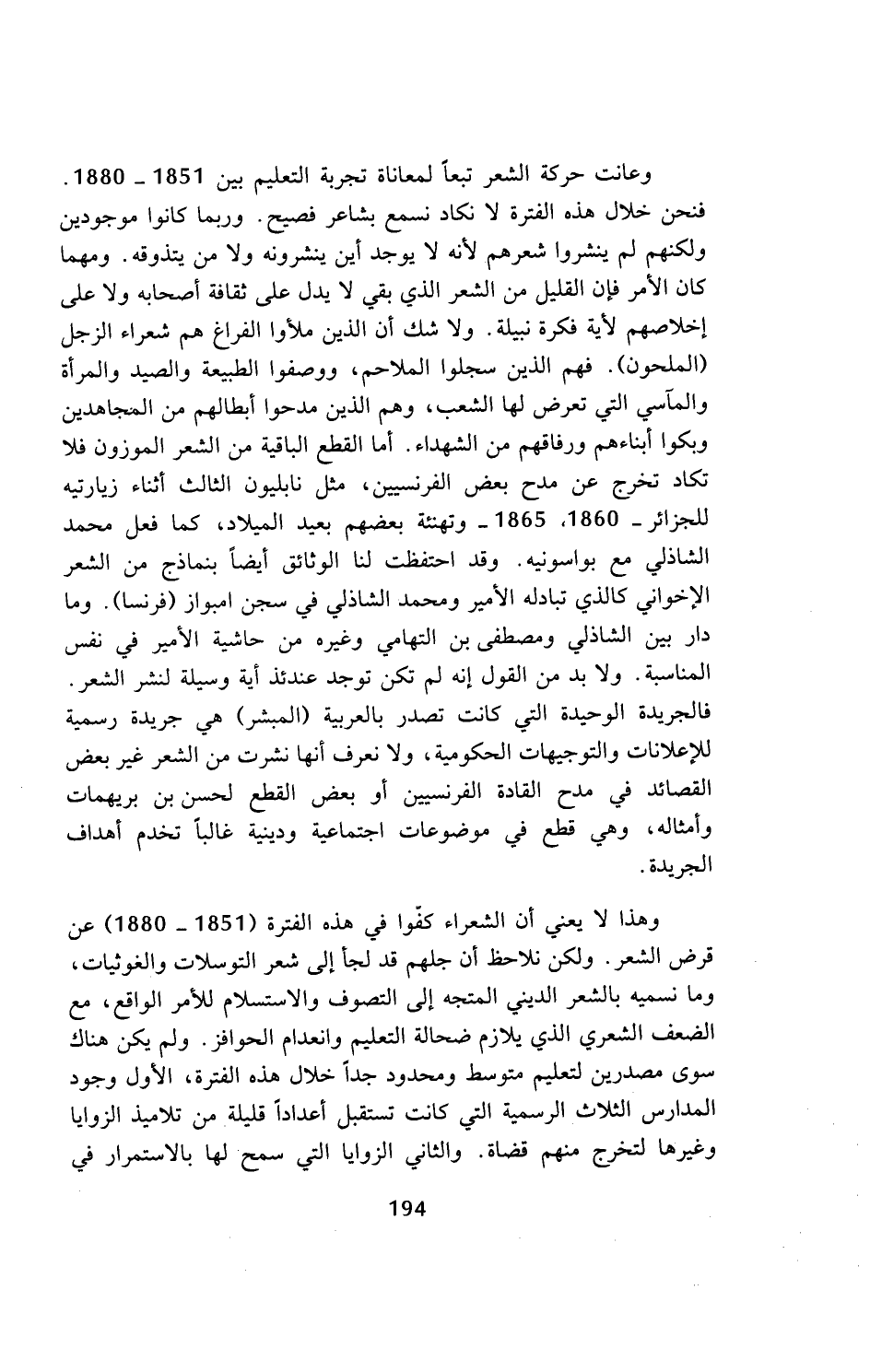 وهذا لا يعني أن الشعراء كفوا في هذه الفترة (1851 - 1880) عن قرض الشعر. ولكن نلاحظ أن جلهم قد لجأ إلى شعر التوسلات والغوثيات، وما نسميه بالشعر الديني المتجه إلى التصوف والاستسلام للأمر الواقع، مع الضعف الشعري الذي يلازم ضحالة التعليم وانعدام الحوافز. ولم يكن هناك سوى مصدرين لتعليم متوسط ومحدود جدا خلال هذه الفترة، الأول وجود المدارس الثلاث الرسمية التي كانت تستقبل أعدادا قليلة من تلاميذ الزوايا وغيرها لتخرج منهم قضاة. والثاني الزوايا التي سمح لها بالاستمرار في