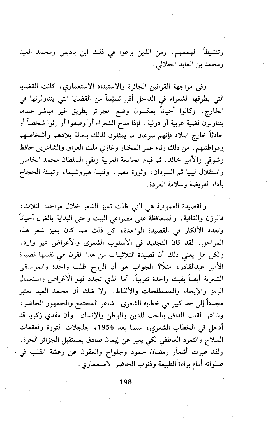والقصيدة العمودية هي التي ظلت تميز الشعر خلال مراحله الثلاث، فالوزن والقافية، والمحافظة على مصراعي البيت وحتى البداية بالغزل أحيانا وتعدد الأفكار في القصيدة الواحدة، كل ذلك مما كان يميز شعر هذه المراحل. لقد كان التجديد في الأسلوب الشعري والأغراض غير وارد. ولكن هل يعني ذلك أن قصيدة الثلاثينات من هذا القرن هي نفسها قصيدة الأمير عبد القادر، مثلا؟ الجواب هو أن الروح ظلت واحدة والموسيقى الشعرية أيضا بقيت واحدة تقريبا. أما الذي تجدد فهو الأغراض واستعمال الرمز والإيحاء والمصطلحات والألفاظ. ولا شك أن محمد العيد يعتبر مجددا إلى حد كبير في خطابه الشعري: شاعر المجتمع والجمهور الحاضر، وشاعر القلب الدافق بالحب للدين والوطن والإنسان. وأن مفدي زكريا قد أدخل في الخطاب الشعري، سيما بعد 1956، جلجلات الثورة وقعقعات السلاح والتمرد العاطفي لكي يعبر عن إيمان صادق بمستقبل الجزائر الحرة. ولقد عبرت أشعار رمضان حمود وجلواح والعقون عن رعشة القلب في صلواته أمام براءة الطبيعة وذنوب الحاضر الاستعماري.