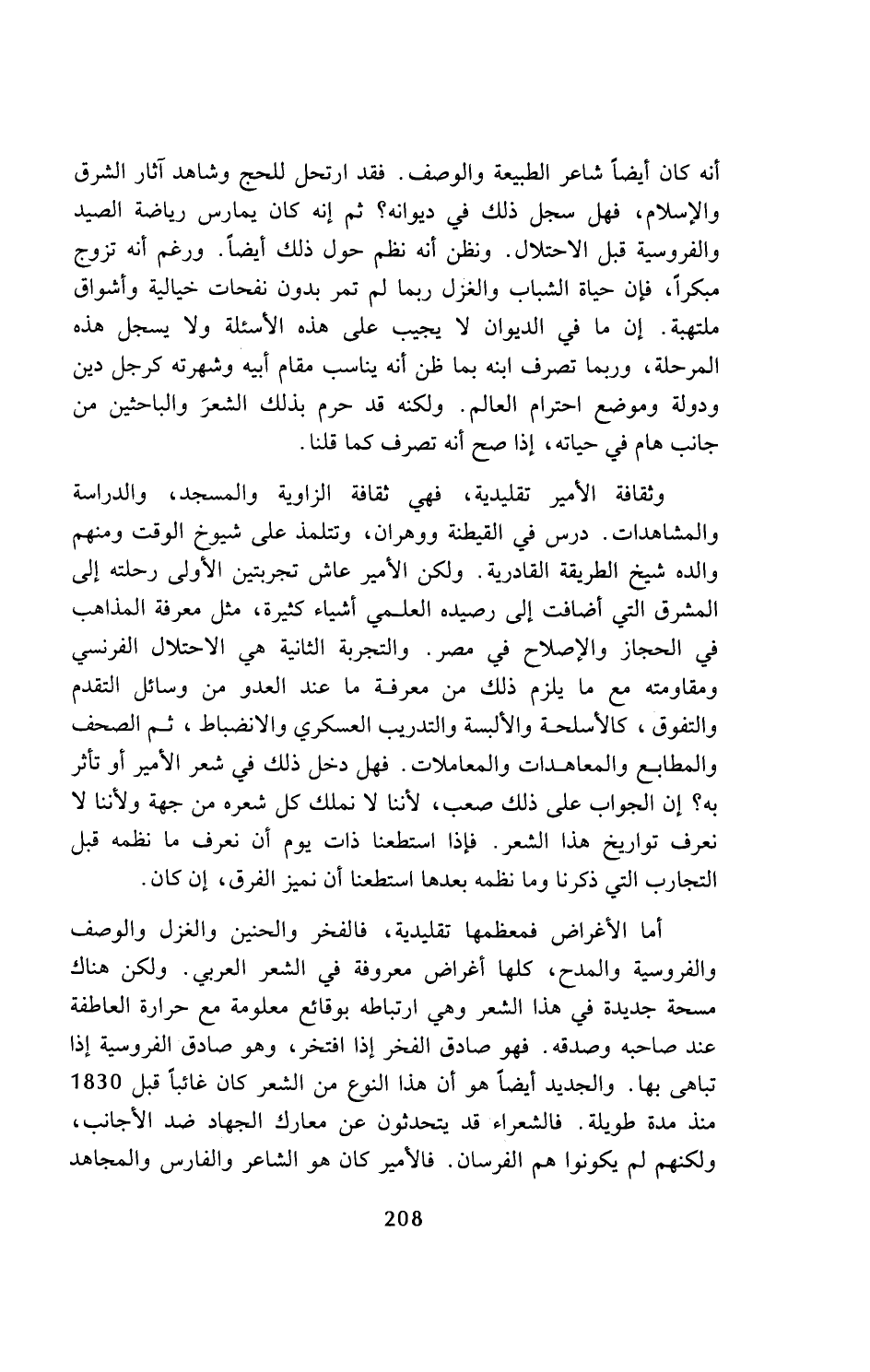أنه كان أيضا شاعر الطبيعة والوصف. فقد ارتحل للحج وشاهد آثار الشرق والإسلام، فهل سجل ذلك في ديوانه؟ ثم إنه كان يمارس رياضة الصيد والفروسية قبل الاحتلال. ونظن أنه نظم حول ذلك أيضا. ورغم أنه تزوج مبكرا، فإن حياة الشباب والغزل ربما لم تمر بدون نفحات خيالية وأشواق ملتهبة. إن ما في الديوان لا يجيب على هذه الأسئلة ولا يسجل هذه المرحلة، وربما تصرف ابنه بما ظن أنه يناسب مقام أبيه وشهرته كرجل دين ودولة وموضع احترام العالم. ولكنه قد حرم بذلك الشعر والباحثين من جانب هام في حياته، إذا صح أنه تصرف كما قلا.