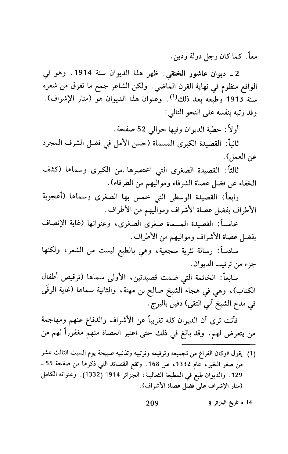 (¬1) يقول (وكان الفراغ من تجميعه وترقيمه وترتيبه وتذنيبه صبيحة يوم السبت الثالث عشر من صفر الخير، عام 1332، ص 168. وتقع القصائد التي ذكرها من صفحة 55 - 129. والديوان طبع في المطبعة الثعالبية، الجزائر 1914 (1332). وعنوانه الكامل (منار الإشراف على فضل عصاة الأشراف).