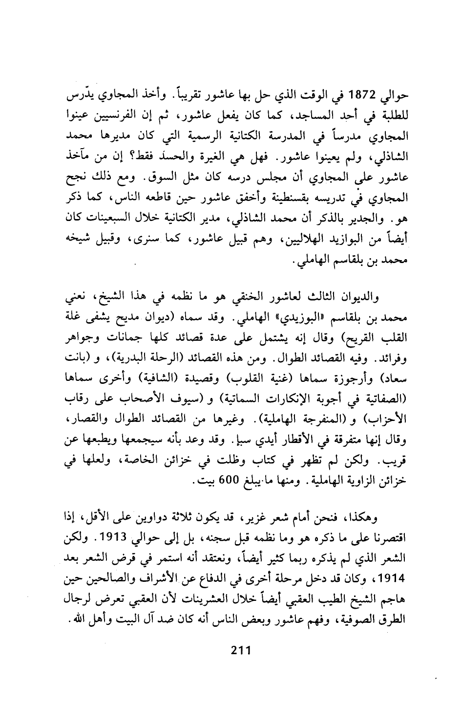 حوالي 1872 في الوقت الذي حل بها عاشور تقريبا. وأخذ المجاوي يدرس للطلبة في أحد المساجد، كما كان يفعل عاشور، ثم إن الفرنسيين عينوا المجاوي مدرسا في المدرسة الكتانية الرسمية التي كان مديرها محمد الشاذلي، ولم يعينوا عاشور. فهل هي الغيرة والحسد فقط؟ إن من مآخذ عاشور على المجاوي أن مجلس درسه كان محل السوق. ومع ذلك نجح المجاوي في تدريسه بقسنطينة وأخفق عاشور حين قاطعه الناس، كما ذكر هو. والجدير بالذكر أن محمد الشاذلي، مدير الكتانية خلال السبعينات كان أيضا من البوازيد الهلاليين، وهم قبيل عاشور، كما سنرى، وقبيل شيخه محمد بن بلقاسم الهاملي.