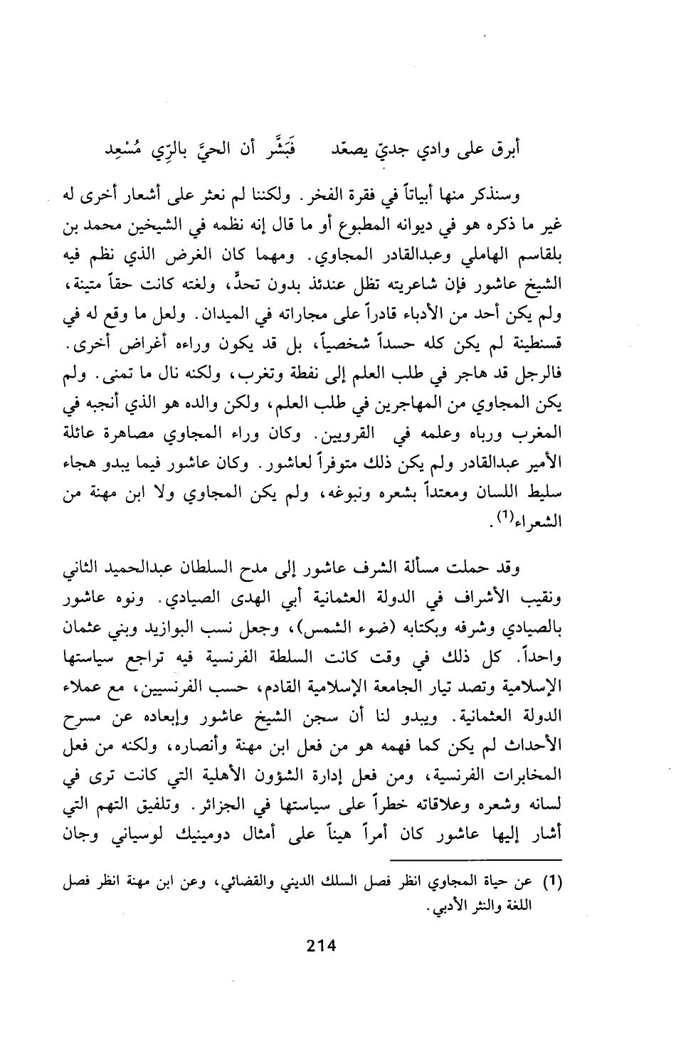 وسنذكر منها أبياتا في فقرة الفخر. ولكننا لم نعثر على أشعار أخرى له غير ما ذكره هو في ديوانه المطبوع أو ما قال إنه نظمه في الشيخين محمد بن بلقاسم الهاملي وعبد القادر المجاوي. ومهما كان الغرض الذي نظم فيه الشيخ عاشور فإن شاعريته تظل عندئذ بدون تحد، ولغته كانت حقا متينة، ولم يكن أحد من الأدباء قادرا، على مجاراته في الميدان. ولعل ما وقع له في قسنطينة لم يكن كله حسدا شخصيا، بل قد يكون وراءه أغراض أخرى. فالرجل قد هاجر في طلب العلم إلى نفطة وتغرب، ولكنه نال ما تمنى. ولم يكن المجاوي من المهاجرين في طلب العلم، ولكن والده هو الذي أنجبه في المغرب ورباه وعلمه في القرويين. وكان وراء المجاوي مصاهرة عائلة الأمير عبد القادر ولم يكن ذلك متوفرا لعاشور. وكان عاشور فيما يبدو هجاء سليط اللسان ومعتدا بشعره ونبوغه، ولم يكن المجاوي ولا ابن مهنة من الشعراء (¬1).
