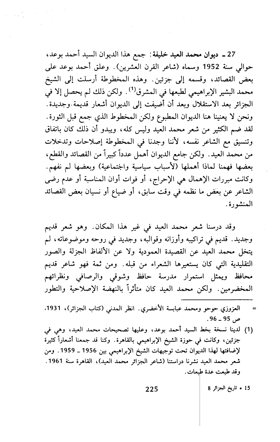 (¬1) لدينا نسخة بخط السيد أحمد بوعد، وعليها تصحيحات محمد العيد، وهي في جزئين، وكانت في حوزة الشيخ الإبراهيمي بالقاهرة. وكنا قد جمعنا أشعارا كثيرة لإضافتها لهذا الديوان تحت توجيهات الشيخ الإبراهيمي بين 1956 - 1959. ومن شعر محمد العيد نشرنا دراستنا (شاعر الجزائر محمد العيد)، القاهرة سنة 1961. وقد طبعت عدة طبعات.