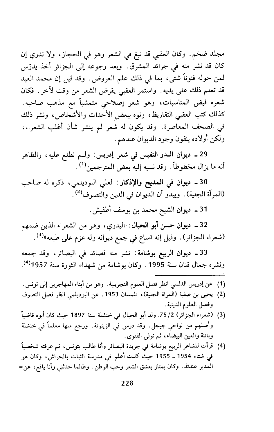 33 - ديوان الربيع بوشامة: نشر منه قصائد في البصائر، وقد جمعه ونشره جمال قنان سنة 1995. وكان بوشامة من شهداء الثورة سنة 1957 (¬4).