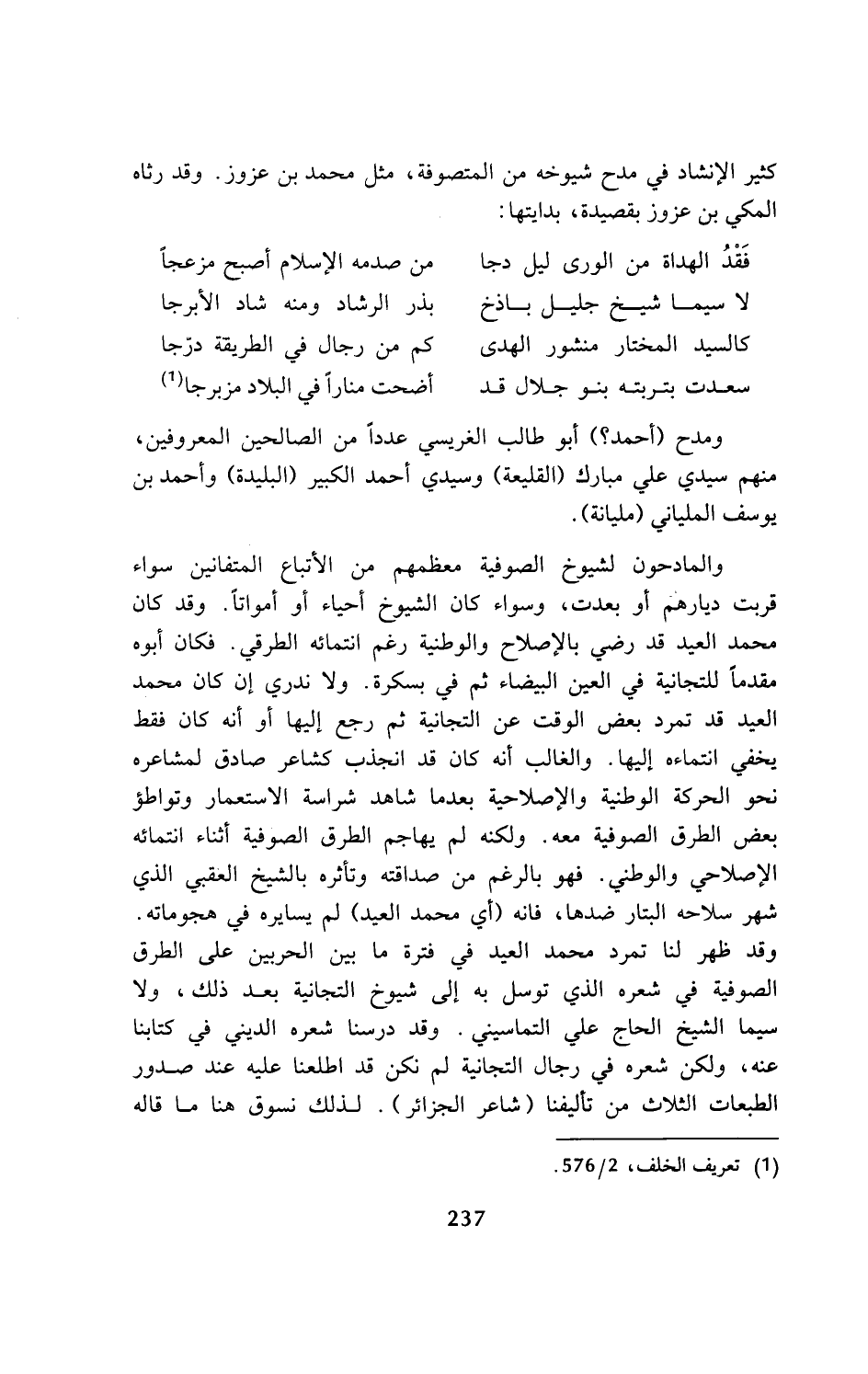 والمادحون لشيوخ الصوفية معظمهم من الأتباع المتفانين سواء قربت ديارهم أو بعدت، وسواء كان الشيوخ أحياء أو أمواتا. وقد كان محمد العيد قد رضي بالإصلاح والوطنية رغم انتمائه الطرقي. فكان أبوه مقدما للتجانية في العين البيضاء ثم في بسكرة. ولا ندري إن كان محمد العيد قد تمرد بعض الوقت عن التجانية ثم رجع إليها أو أنه كان فقط يخفي انتماءه إليها. والغالب أنه كان قد انجذب كشاعر صادق لمشاعره نحو الحركة الوطنية والإصلاحية بعدما شاهد شراسة الاستعمار وتواطؤ بعض الطرق الصوفية معه. ولكنه لم يهاجم الطرق الصوفية أثناء انتمائه الإصلاحي والوطني. فهو بالرغم من صداقته وتأثره بالشيخ العقبي الذي شهر سلاحه البتار ضدها، فانه (آي محمد العيد) لم يسايره في هجوماته. وقد ظهر لنا تمرد محمد العيد في فترة ما بين الحربين على الطرق الصوفية في شعره الذي توسل به إلى شيوخ التجانية بعد ذلك، ولا سيما الشيخ الحاج علي التماسيني. وقد درسنا شعره الديني في كتابنا عنه، ولكن شعره في رجال التجانية لم نكن قد اطلعنا عليه عند صدور الطبعات الثلاث من تأليفنا (شاعر الجزائر). لذلك نسوق هنا ما قاله