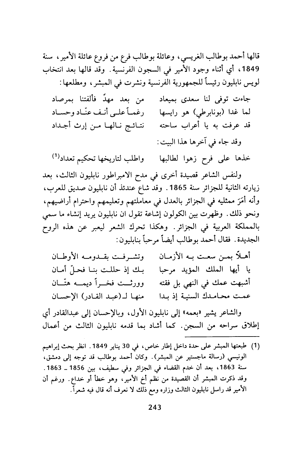 (¬1) طبعتها المبشر على حدة داخل إطار خاص، في 30 يناير 1849. انظر بحث إبراهيم الونيسي (رسالة ماجستير عن المبشر). وكان أحمد بوطالب قد توجه إلى دمشق، سنة 1863، بعد أن خدم القضاء في الجزائر وفي سطيف، بين 1856 - 1863. وقد ذكرت المبشر أن القصيدة من نظم أخ الأمير، وهو خطأ أو خداع. ورغم أن الأمير قد راسل نابليون الثالث وزاره ومع ذلك لا نعرف أنه قال فيه شعرا.