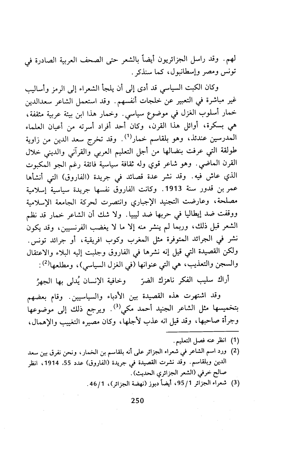 وكان الكبت السياسي قد أدى إلى أن يلجأ الشعراء إلى الرمز وأساليب غير مباشرة في التعبير عن خلجات أنفسهم. وقد استعمل الشاعر سعد الدين خمار أسلوب الغزل في موضوع سياسي. وخمار هذا ابن بيئة عربية مثقفة، هي بسكرة، أوائل هذا القرن، وكان أحد أفراد أسرته من أعيان العلماء المدرسين عندئذ، وهو بلقاسم خمار (¬1). وقد تخرج سعد الدين من زاوية طولقة التي عرفت بنضالها من أجل التعليم العربي والقرآني والديني خلال القرن الماضي. وهو شاعر قوي وله ثقافة سياسية فائقة رغم الجو المكبوت الذي عاش فيه. وقد نشر عدة قصائد في جريدة (الفاروق) التي أنشأها عمر بن قدور سنة 1913. وكانت الفاروق نفسها جريدة سياسية إسلامية مصلحة، وعارضت التجنيد الإجباري وانتصرت لحركة الجامعة الإسلامية ووقفت ضد إيطاليا في حربها ضد ليبيا. ولا شك أن الشاعر خمار قد نظم الشعر قبل ذلك، وربما لم ينشر منه إلا ما لا يغضب الفرنسيين، وقد يكون نشر في الجرائد المتوفرة مثل المغرب وكوب افريقية، أو جرائد تونس. ولكن القصيدة التي قيل إنه نشرها في الفاروق وجلبت إليه البلاء والاعتقال والسجن والتعذيب، هي التي عنوانها (في الغزل السياسي)، ومطلعها (¬2):