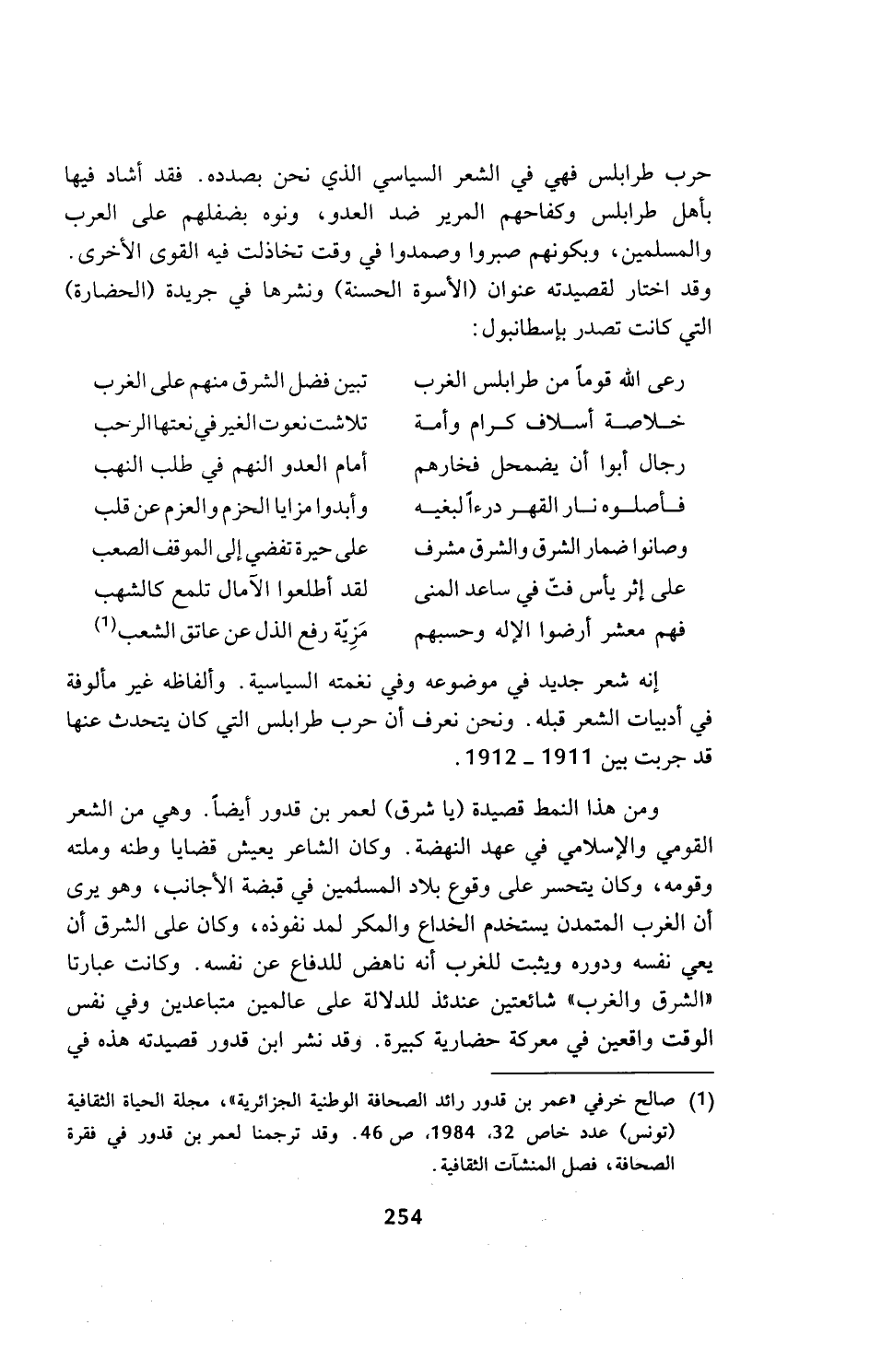 (¬1) صالح خرفي (عمر بن قدور رائد الصحافة الوطنية الجزائرية)، مجلة الحياة الثقافية (تونس) عدد خاص 32، 1984، ص 46. وقد ترجمنا لعمر بن قدور في فقرة الصحافة، فصل المنشآت الثقافية.