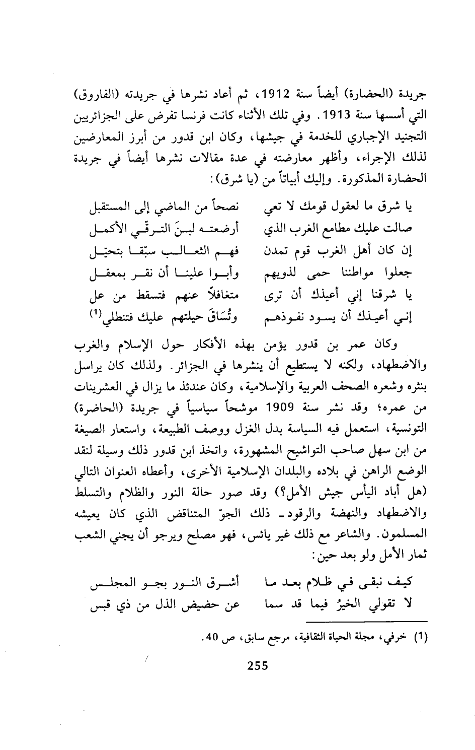جريدة (الحضارة) أيضا سنة 1912، ثم أعاد نشرها في جريدته (الفاروق) التي أسسها سنة 1913. وفي تلك الأثناء كانت فرنسا تفرض على الجزائريين التجنيد الإجباري للخدمة في جيشها، وكان ابن قدور من أبرز المعارضين لذلك الإجراء، وأظهر معارضته في عدة مقالات نشرها أيضا في جريدة الحضارة المذكورة. وإليك أبياتا من (يا شرق):