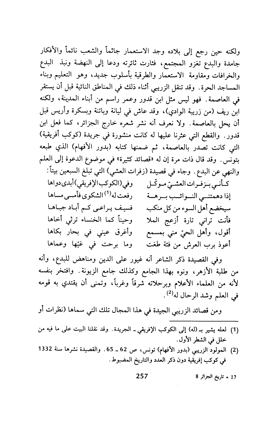 ولكنه حين رجع إلى بلاده وجد الاستعمار جاثما والشعب نائما والأفكار جامدة والبدع تغزو المجتمع، فثارت ثائرته ودعا إلى النهضة ونبذ البدع والخرافات ومقاومة الاستعمار والطرقية بأسلوب جديد، وهو التعليم وبناء المساجد الحرة. وقد تنقل الزريبي أثناء ذلك في المناطق النائية قبل أن يستقر في العاصمة. فهو ليس مثل ابن قدور وعمر راسم من أبناء المدية، ولكنه ابن ريف (من زريبة الوادي)، وقد عاش في ليانة وباتنة وبسكرة وأريس قبل أن يحل بالعاصمة. ولا نعرف أنه نشر شعره خارج الجزائر، كما فعل ابن قدور. والقطع التي عثرنا عليها له كانت منشورة في جريدة (كوكب أفريقية) التي كانت تصدر بالعاصمة، ثم ضمنها كتابه (بدور الأفهام) الذي طبعه بتونس. وقد قال ذات مرة إن له (قصائد كثيرة) في موضوع الدعوة إلى العلم والنهي عن البدع. وجاء في قصيدة (زفرات العشي) التي تبلغ السبعين بيتا: