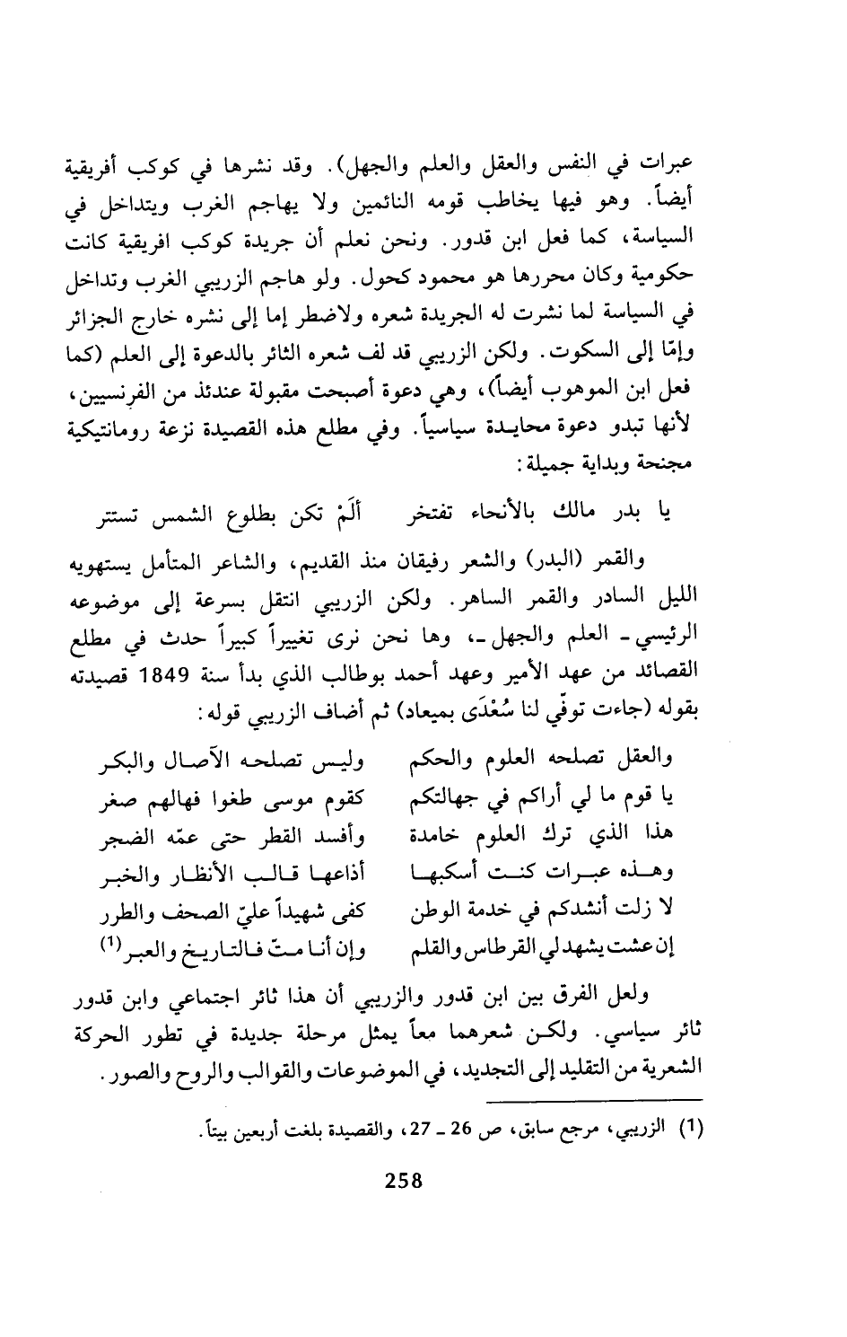 عبرات في النفس والعقل والعلم والجهل). وقد نشرها في كوكب أفريقية أيضا. وهو فيها يخاطب قومه النائمين ولا يهاجم الغرب ويتداخل في السياسة، كما فعل ابن قدور. ونحن نعلم أن جريدة كوكب افريقية كانت حكومية وكان محررها هو محمود كحول. ولو هاجم الزريبي الغرب وتداخل في السياسة لما نشرت له الجريدة شعره ولاضطر إما إلى نشره خارج الجزائر وإما إلى السكوت. ولكن الزريبي قد لف شعره الثائر بالدعوة إلى العلم (كما فعل ابن الموهوب أيضا)، وهي دعوة أصبحت مقبولة عندئذ من الفرنسيين، لأنها تبدو دعوة محايدة سياسيا. وفي مطلع هذه القصيدة نزعة رومانتيكية مجنحة وبداية جميلة: