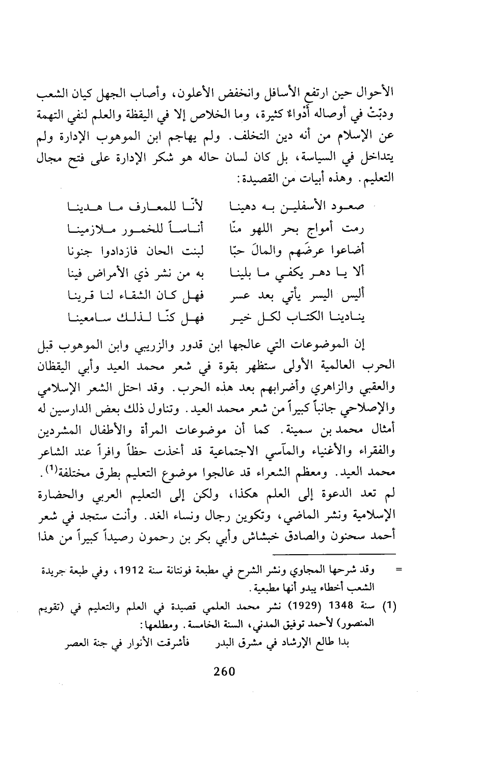الأحوال حين ارتفع الأسافل وانخفض الأعلون، وأصاب الجهل كيان الشعب ودبت في أوصاله أدواء كثيرة، وما الخلاص إلا في اليقظة والعلم لنفي التهمة عن الإسلام من أنه دين التخلف. ولم يهاجم ابن الموهوب الإدارة ولم يتداخل في السياسة، بل كان لسان حاله هو شكر الإدارة على فتح مجال التعليم. وهذه أبيات من القصيدة: