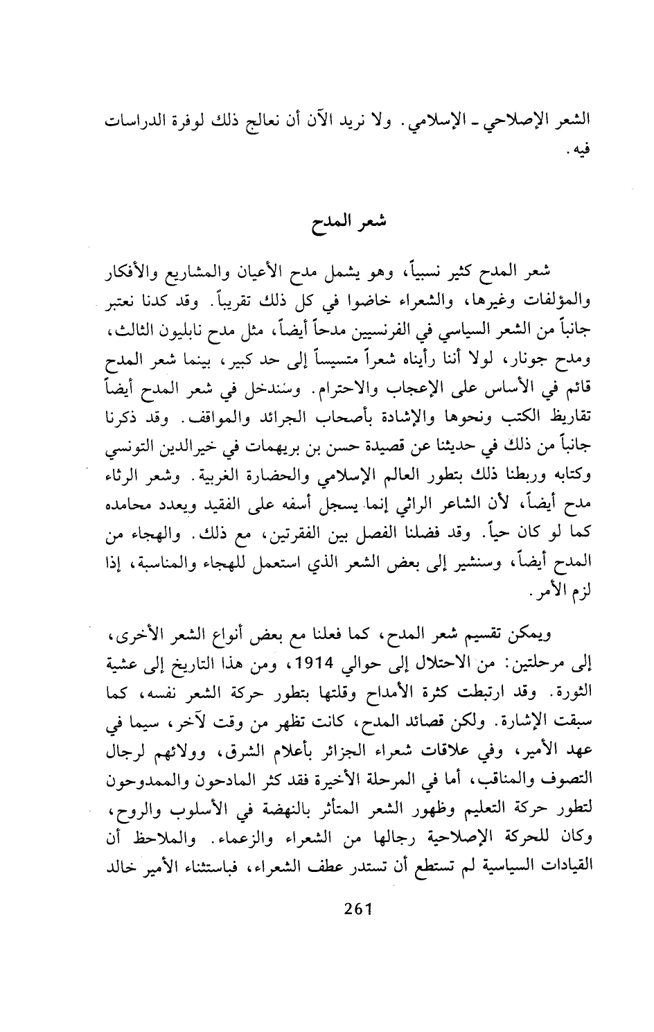 ويمكن تقسيم شعر المدح، كما فعلنا مع بعض أنواع الشعر الأخرى، إلى مرحلتين: من الاحتلال إلى حوالي 1914، ومن هذا التاريخ إلى عشية الثورة. وقد ارتبطت كثرة الأمداح وقلتها بتطور حركة الشعر نفسه، كما سبقت الإشارة. ولكن قصائد المدح، كانت تظهر من وقت لآخر، سيما في عهد الأمير، وفي علاقات شعراء الجزائر بأعلام الشرق، وولائهم لرجال التصوف والمناقب، أما في المرحلة الأخيرة فقد كثر المادحون والممدوحون لتطور حركة التعليم وظهور الشعر المتأثر بالنهضة في الأسلوب والروح، وكان للحركة الإصلاحية رجالها من الشعراء والزعماء. والملاحظ أن القيادات السياسية لم تستطع أن تستدر عطف الشعراء، فباستثناء الأمير خالد