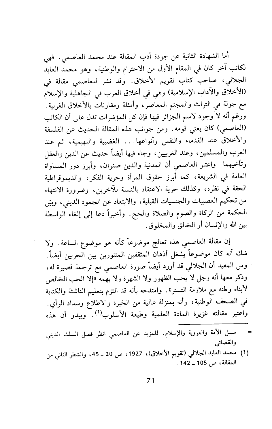 (¬1) محمد العابد الجلالي (تقويم الأخلاق)، 1927، ص 20 - 45، والشطر الثاني من المقالة، ص 105 - 142.