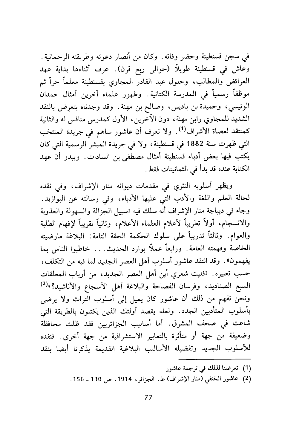 في سجن قسنطينة وحضر وفاته. وكان من أنصار دعوته وطريقته الرحمانية. وعاش في قسنطينة طويلا (حوالى ربع قرن). عرف أثناءها بداية عهد العرائض والمطالب، وحلول عبد القادر المجاوي بقسنطينة معلمار حرا ثم موظفا رسميا في المدرسة الكتانية. وظهور علماء آخرين أمثال حمدان الونيسي، وحميدة بن باديس، وصالح بن مهنة. وقد وجدناه يتعرض بالنقد الشديد للمجاوي وابن مهنة، دون الآخرين، الأول كمدرس منافس له والثانية كمنتقد لعصاة الأشراف (¬1). ولا نعرف أن عاشور ساهم في جريدة المنتخب التي ظهرت سنة 1882 في قسنطينة، ولا في جريدة المبشر الرسمية التي كان يكتب فيها بعض أدباء قسنطينة أمثال مصطفى بن السادات. ويبدو أن عهد الكتابة عنده قد بدأ في الثمانينات فقط.