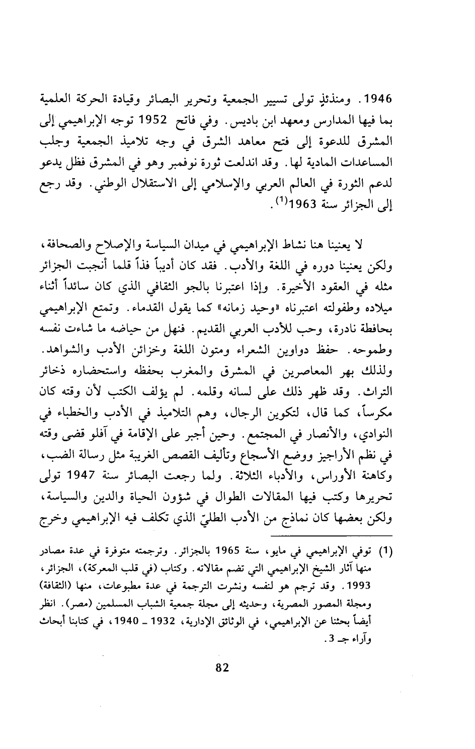 (¬1) توفي الإبراهيمي في مايو، سنة 1965 بالجزائر. وترجمته متوفرة في عدة مصادر منها آثار الشيخ الإبراهيمي التي تضم مقالاته. وكتاب (في قلب المعركة)، الجزائر، 1993. وقد ترجم هو لنفسه ونشرت الترجمة في عدة مطبوعات، منها (الثقافة) ومجلة المصور المصرية، وحديثه إلى مجلة جمعية الشباب المسلمين (مصر). انظر أيضا بحثنا عن الإبراهيمي، في الوثائق الإدارية، 1932 - 1940، في كتابنا أبحاث وآراء ج 3.