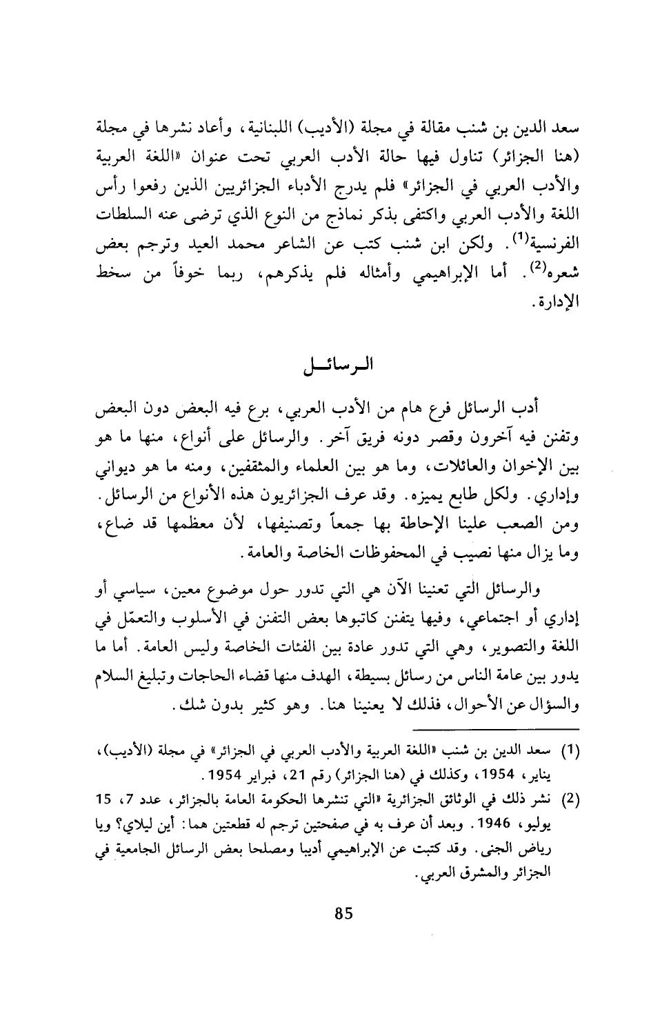 (¬1) سعد الدين بن شنب (اللغة العربية والأدب العربي في الجزائر) في مجلة (الأديب)، يناير، 1954، وكذلك في (هنا الجزائر) رقم 21، فبراير 1954.