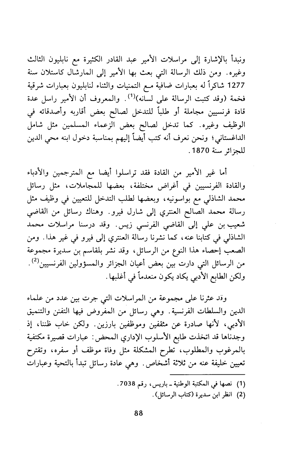 أما غير الأمير من القادة فقد تراسلوا أيضا مع المترجمين والأدباء والقادة الفرنسيين في أغراض مختلفة، بعضها للمجاملات، مثل رسائل محمد الشاذلي مع بواسونيه، وبعضها لطلب التدخل للتعيين في وظيف مثل رسالة محمد الصالح العنتري إلى شارل فيرو. وهناك رسائل من القاضي شعيب بن علي إلى القاضي الفرنسي زيس. وقد درسنا مراسلات محمد الشاذلي في كتابنا عنه، كما نشرنا رسالة العنتري إلى فيرو في غير هذا. ومن الصعب إحصاء هذا النوع من الرسائل، وقد نشر بلقاسم بن سديرة مجموعة من الرسائل التي دارت بين بعض أعيان الجزائر والمسؤولين الفرنسيين (¬2). ولكن الطابع الأدبي يكاد يكون منعدما في أغلبها.