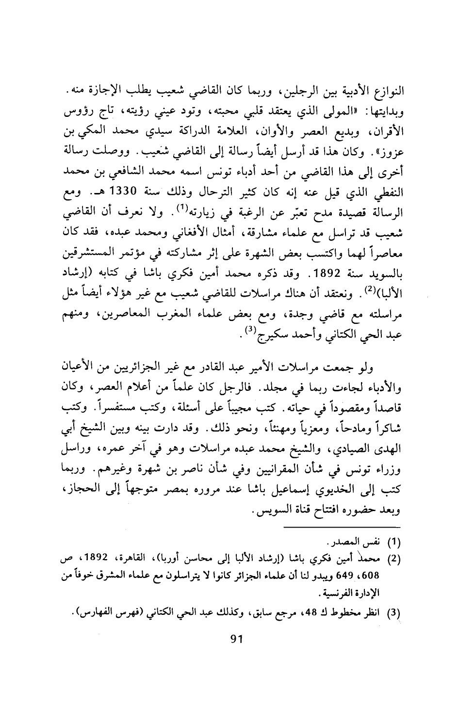 (¬2) محمد أمين فكري باشا (إرشاد الألبا إلى محاسن أوربا)، القاهرة، 1892، ص 608، 649 ويبدو لنا أن علماء الجزائر كانوا لا يتراسلون مع علماء المشرق خوفا من الإدارة الفرنسية.