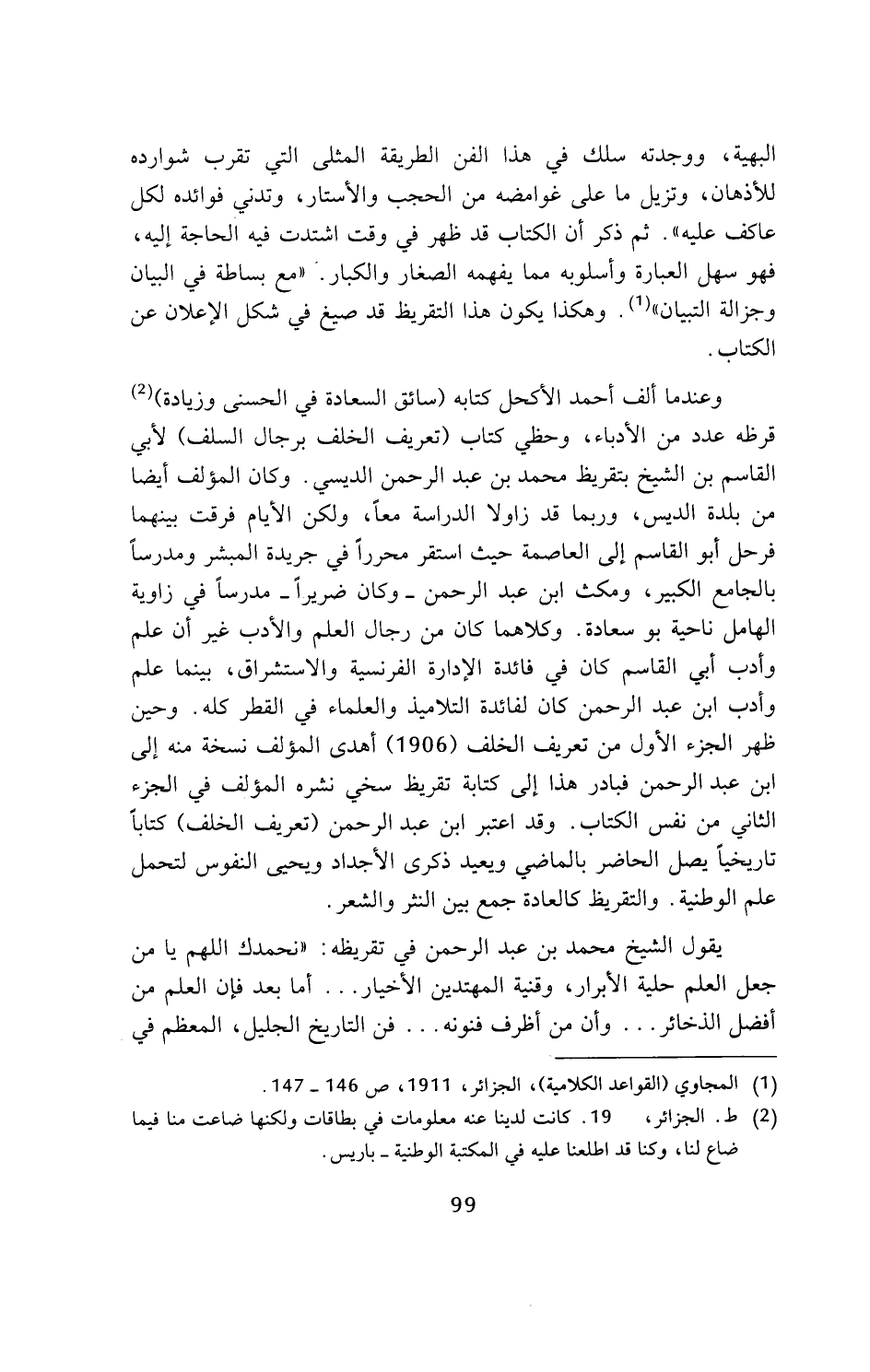 وعندما ألف أحمد الأكحل كتابه (سائق السعادة في الحسنى وزيادة) (¬2) قرظه عدد من الأدباء، وحظي كتاب (تعريف الخلف برجال السلف) لأبي القاسم بن الشيخ بتقريظ محمد بن عبد الرحمن الديسي. وكان المؤلف أيضا من بلدة الديس، وربما قد زاولا الدراسة معا، ولكن الأيام فرقت بينهما فرحل أبو القاسم إلى العاصمة حيث استقر محررا في جريدة المبشر ومدرسا بالجامع الكبير، ومكث ابن عبد الرحمن - وكان ضريرا - مدرسا في زاوية الهامل ناحية بو سعادة. وكلاهما كان من رجال العلم والأدب غير أن علم وأدب أبي القاسم كان في فائدة الإدارة الفرنسية والاستشراق، بينما علم وأدب ابن عبد الرحمن كان لفائدة التلاميذ والعلماء في القطر كله. وحين ظهر الجزء الأول من تعريف الخلف (1906) أهدى المؤلف نسخة منه إلى ابن عبد الرحمن فبادر هذا إلى كتابة تقريظ سخي نشره المؤلف في الجزء الثاني من نفس الكتاب. وقد اعتبر ابن عبد الرحمن (تعريف الخلف) كتابا تاريخيا يصل الحاضر بالماضي ويعيد ذكرى الأجداد ويحيى النفوس لتحمل علم الوطنية. والتقريظ كالعادة جمع بين النثر والشعر.