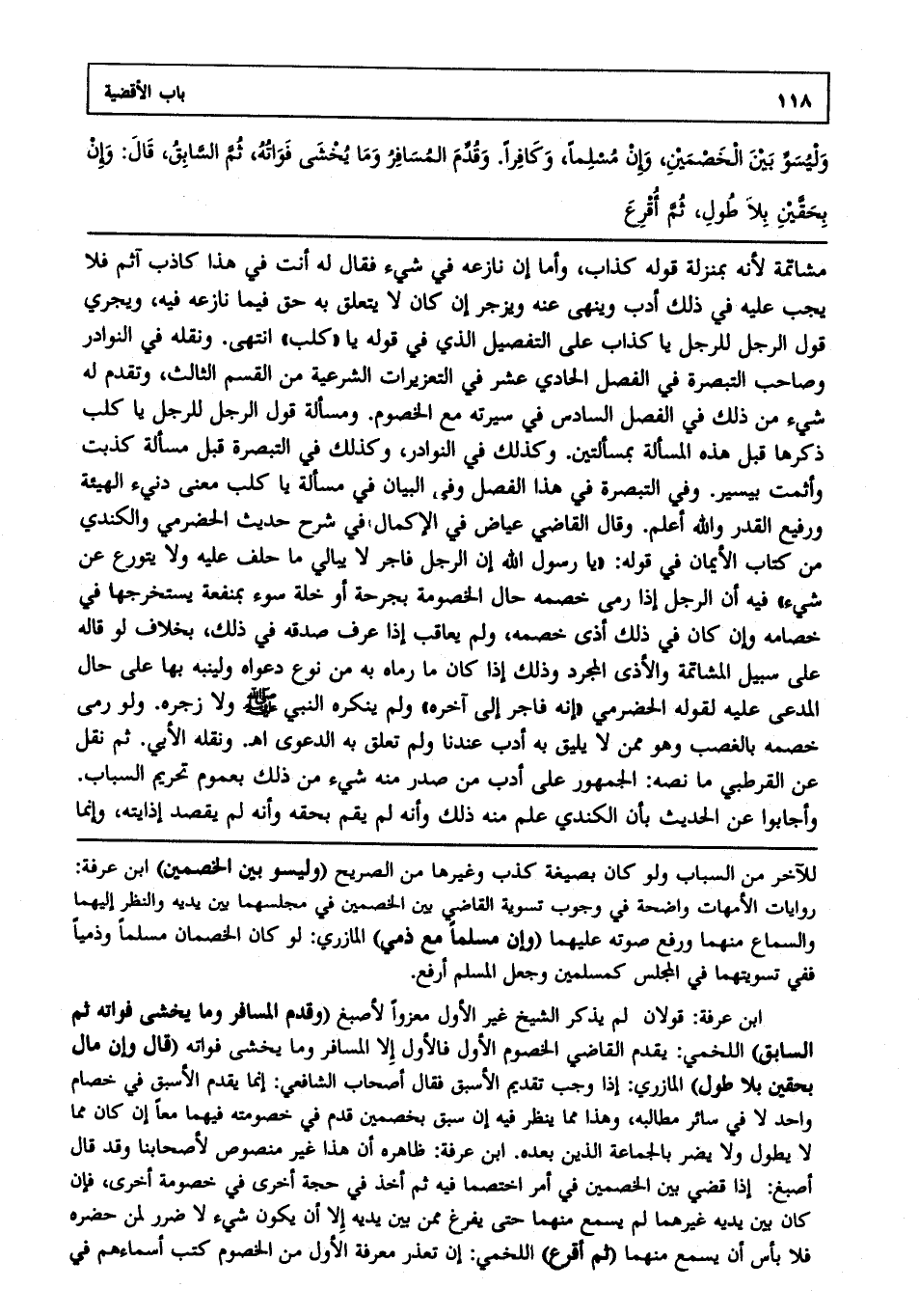 وليسوّ بين الخصمين، وإن مسلماً وكافراً، وقدم المسافر وما يخشى فوته، ثم السابق قال: وإن بحقين بلا طول ثم أقرع