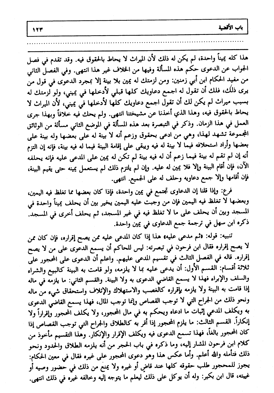 والقسم الثاني: ما يلزمه في ماله إذا قامت به البينة ولا يلزمه بإقراره كالغصب والاستهلاك والإتلاف واستحقاق شيء من ماله ونحو ذلك من الجراح التي لا توجب القصاص وإنما توجب المال فهذا يسمع القاضي الدعوى به ويكلف المدعي إثبات ما ادعاه ويحكم به في مال المحجور ولا يكلف المحجور إقرارا ولا إنكارا، القسم الثالث: ما يلزم المحجور إذا أقر به كالطلاق والجراح التي توجب القصاص إذا كان المحجور بالغا فهذا تسمع الدعوى فيه ويكلف الإقرار والإنكار وهذا التقسيم مأخوذ من كلام ابن فرحون المشار إليه وما ذكره في باب الحجر من أنه يلزمه الطلاق والحدود ونحو ذلك فتأمله، والله أعلم. وأما عكس هذا وهو دعوى المحجور على غيره، فقال في معين الحكام: يجوز للمحجور طلب حقوقه كلها عند قاض أو غيره ولا يمنع من ذلك في حضور وصيه أو غيبته، قال ابن بكير: وله أن يوكل على ذلك ليعلم ما يتوجه إليه وخالفه غيره في ذلك، انتهى.
