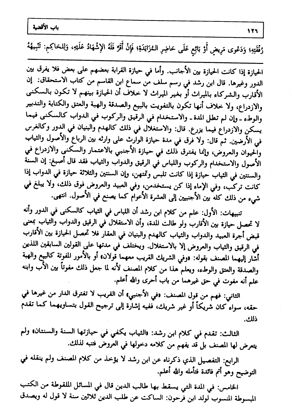 الحيازة إذا كانت الحيازة بين الأجانب وأما في حيازة القرابة بعضهم على بعض فلا يفرق بين الدور وغيرها، قال ابن رشد في رسم سلف من سماع ابن القاسم من كتاب الاستحقاق: إن الأقارب والشركاء بالميراث أو بغير الميراث لا خلاف أن الحيازة بينهم لا تكون بالسكنى والازدراع ولا خلاف أنها تكون بالتفويت بالبيع والصدقة والهبة والعتق والكتابة والتدبير والوطء وإن لم تطل المدة والاستخدام في الرقيق والركوب في الدواب كالسكنى فيما يسكن والازدراع فيما يزرع، قال: والاستغلال في ذلك كالهدم والبنيان في الدور وكالغرس في الأرضين، ثم قال: ولا فرق في مدة حيازة الوارث على وارثه بين الرباع والأصول والثياب والحيوان والعروض وإنما يفترق ذلك في حيازة الأجنبي بالاعتمار والسكنى والازدراع في الأصول والاستخدام والركوب واللباس في الرقيق والدواب والثياب فقد قال أصبغ: إن السنة والسنتين في الثياب حيازة إذا كانت تلبس وتمتهن وإن السنتين والثلاثة حيازة في الدواب إذا كانت تركب وفي الإماء إذا كن يستخدمن وفي العبيد والعروض فوق ذلك ولا يبلغ في شيء من ذلك كله بين الأجنبيين إلى العشرة الأعوام كما يصنع في الأصول، انتهى.