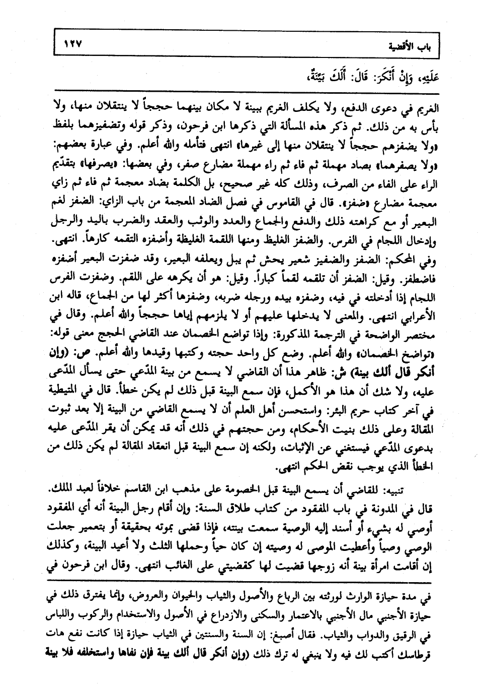 الغريم في دعوى الدفع ولا يكلف الغريم ببينة لا مكان بينهما حججا لا ينتقلان منها ولا بأس به من ذلك ثم ذكر هذه المسألة التي ذكرها ابن فرحون وذكر قوله: وتضفيزهما بلفظ "ولا يضفزهم حججا لا ينتقلان منها إلى غيرها" انتهى. فتأمله، والله أعلم. وفي عبارة بعضهم: "ولا يصفرهما" بصاد مهملة ثم فاء ثم راء مهملة مضارع صفر وفي بعضها: "يصرفها" بتقديم الراء على الفاء من الصرف وذلك كله غير صحيح بل الكلمة بضاد معجمة ثم فاء ثم زاي معجمة مضارع ضفز، قال في القاموس في فصل الضاد المعجمة من باب الزاي: الضفز: لقم البعير أو مع كراهته ذلك والدفع والجماع والعدد والوثب والعقد والضرب باليد والرجل وإدخال اللجام في الفرس والضفيز الغليظ ومنها اللقمة الغليظة وأضفزه التقمه كارها انتهى. وفي المحكم الضفز والضفيز شعير يحش ثم يبل ويعلفه البعير وقد ضفزت البعير أضفزه فاضطفز وقيل الضفز أن تلقمه لقما كبارا وقيل هو أن يكرهه على اللقم وضفزت الفرس اللجام إذا أدخلته في فيه وضفزه بيده ورجله ضربه وضفزها أكثر لها من الجماع، قاله ابن الأعرابي، انتهى. والمعنى لا يدخلها عليهم أو لا يلزمهم إياها حججا، والله أعلم. وقال في مختصر الواضحة في الترجمة المذكورة: وإذا تواضع الخصمان عند القاضي الحجج معنى قوله: "تواضع الخصمان" والله أعلم. وضع كل واحد حجته وكتبها وقيدها، والله أعلم. ص: (وإن أنكر، قال: ألك بينة) ش: ظاهر هذا أن القاضي لا يسمع من بينة المدعي حتى يسأل المدعى عليه ولا شك أن هذا هو الأكمل فإن سمع البينة قبل ذلك لم يكن خطأ، قال في المتيطية في آخر كتاب حريم البئر: واستحسن أهل العلم أن لا يسمع القاضي من البينة إلا بعد ثبوت المقالة وعلى ذلك بنيت الأحكام ومن حجتهم في ذلك أنه قد يمكن أن يقر المدعى عليه بدعوى فيستغني عن الإثبات ولكنه إن سمع البينة قبل انعقاد المقالة لم يكن ذلك من الخطإ الذي يوجب نقض الحكم، انتهى.