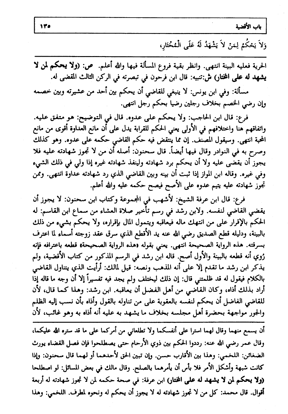 مسألة: وفي ابن يونس: لا ينبغي للقاضي أن يحكم بين أحد من عشيرته وبين خصمه وإن رضي الخصم بخلاف رجلين رضيا بحكم رجل، انتهى.