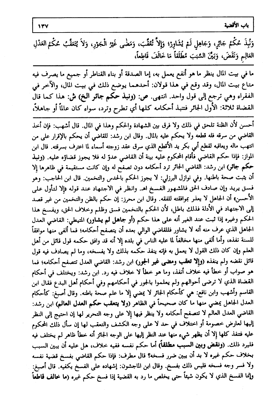 ونبذ حكم جائر، وجاهل لم يشاور، وإلا تعقب ومضى غير الجور، ولا يتعقب حكم العدل العالم ونقض، وبيّن السبب مطلقاً ما خالف قاطعاً،