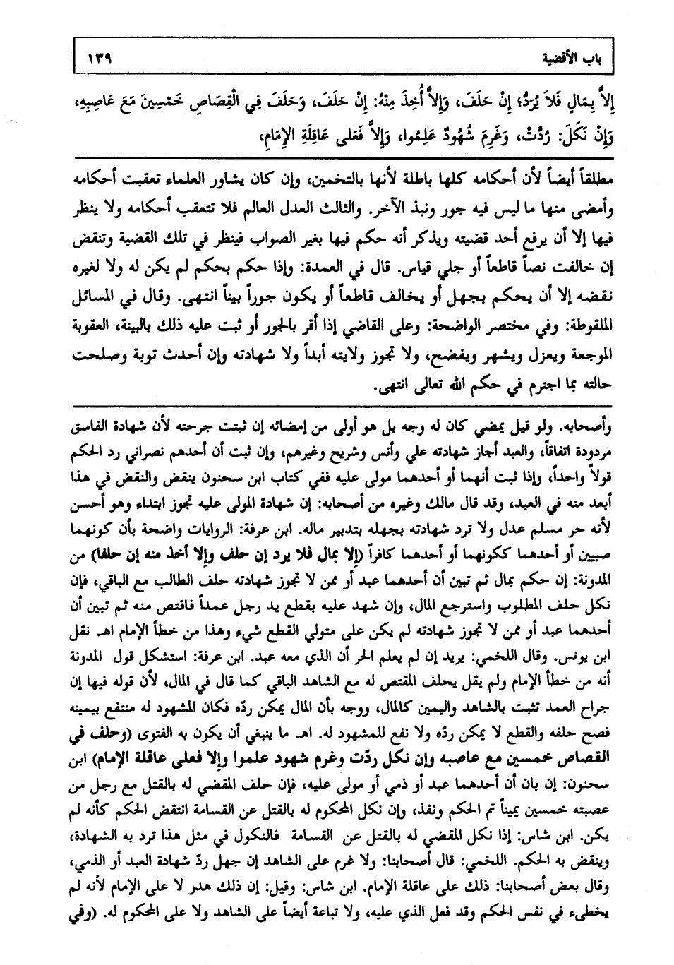 مطلقا أيضاً؛ لأن أحكامه كلها باطلة؛ لأنها بالتخمين وإن كان يشاور العلماء تعقبت أحكامه وأمضي منها ما ليس فيه جور ونبذ الآخر، والثالث: العدل العالم فلا تتعقب أحكامه ولا ينظر فيها إلا أن يرفع أحد قضيته ويذكر أنه حكم فيها بغير الصواب فينظر في تلك القضية وتنقض إن خالفت نصا قاطعا أو جلي قياس، قال في العمدة: وإذا حكم بحكم لم يكن له ولا لغيره نقضه إلا أن يحكم بجهل أو يخالف قاطعا أو يكون جورا بينا، انتهى. وقال في المسائل الملقوطة وفي مختصر الواضحة: وعلى القاضي إذا أقر بالجور أو ثبت عليه ذلك بالبينة العقوبة الموجعة ويعزل ويشهر ويفضح ولا تجوز ولايته أبدا ولا شهادته وإن أحدث توبة وصلحت حالته بما اجترم في حكم الله تعالى، انتهى.