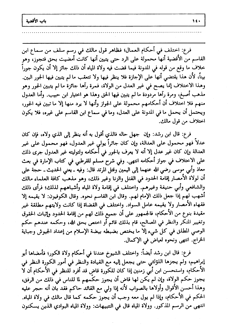 فرع: قال ابن رشد أيضا: واختلف الشيوخ عندنا في أحكام ولاة الكور فأمضاها أبو إبراهيم ولم يجزها اللؤلئي حتى يجعل إليه مع القيادة والنظر في أمور الكورة النظر في الأحكام واستحسن ابن أبي زمنين إذا كان للكورة قاض قد أفرد للنظر في الأحكام أن لا يجوز حكم الولاة وإن لم يكن لها قاض أن يجوز حكمهم لما للناس في ذلك من الرفق وهذا أحسن الأقوال وأولاها بالصواب؛ لأنه إذا ولي مع القائد حاكم فقد بان أنه حجر عليه الحكم في الأحكام وإذا لم يول معه وجب أن يجوز حكمه كما قال مالك في ولاة المياه، انتهى من الرسم المذكور وولاة المياه، قال في التنبيهات: وولاة المياه البوادي الذين يسكنون