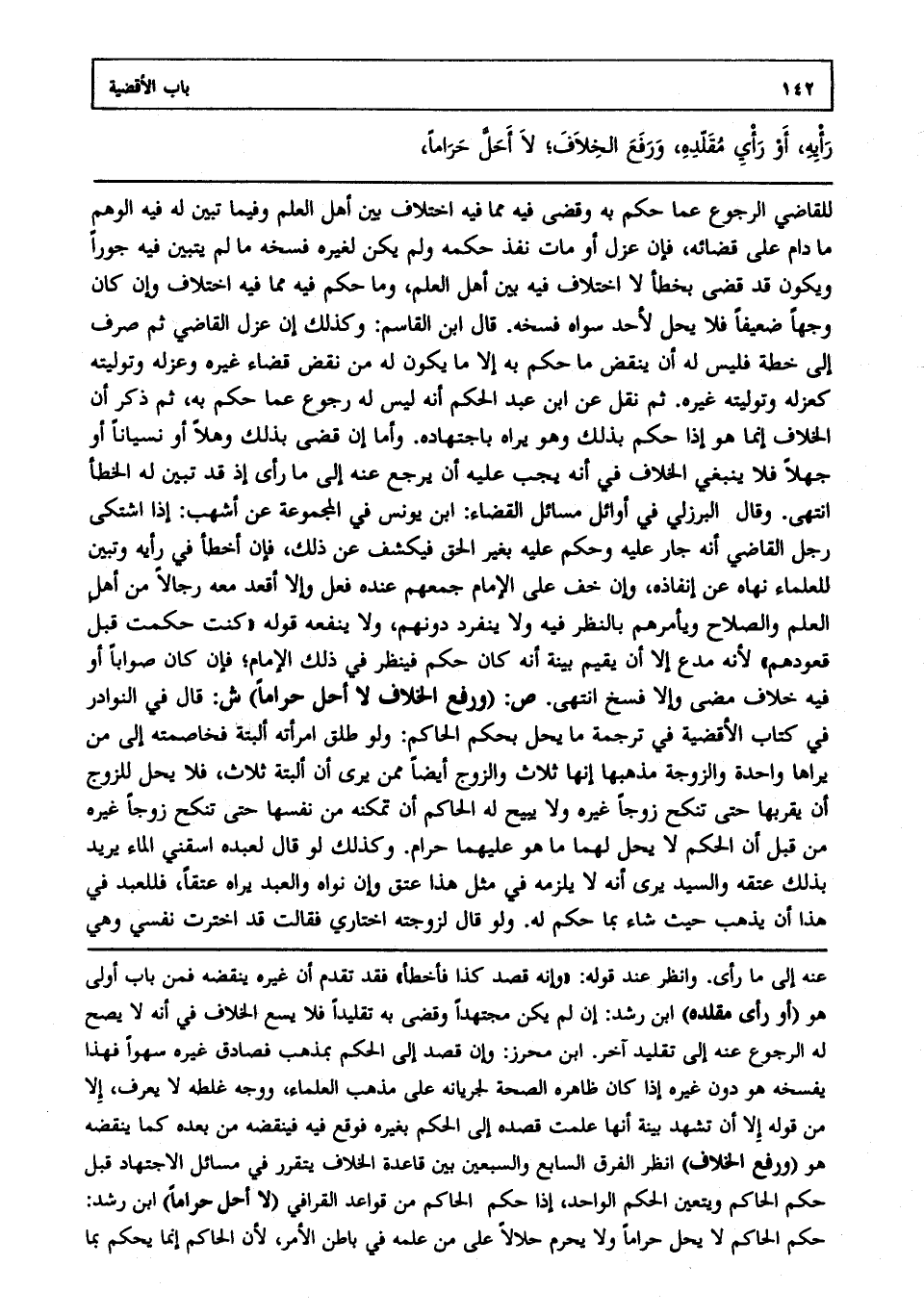 للقاضي الرجوع عما حكم به وقضى فيه مما فيه اختلاف بين أهل العلم وفيما تبين له فيه الوهم ما دام على قضائه فإن عزل أو مات نفذ حكمه ولم يكن لغيره فسخه ما لم يتبين فيه جور أو يكون قد قضى بخطأ لا اختلاف فيه بين أهل العلم وما حكم فيه مما فيه اختلاف وإن كان وجها ضعيفا فلا يحل لأحد سواه فسخه، قال ابن القاسم: وكذلك إن عزل القاضي ثم صرف إلى خطة فليس له أن ينقض ما حكم به إلا ما يكون له من نقض قضاء غيره، وعزله وتوليته كعزله وتوليته غيره ثم نقل عن ابن عبد الحكم أنه ليس له رجوع عما حكم به ثم ذكر أن الخلاف إنما هو إذا حكم بذلك وهو يراه باجتهاده وأما إن قضى بذلك وهلا أو نسيانا أو جهلا فلا ينبغي الخلاف في أنه يجب عليه أن يرجع عنه إلى ما رأى إذ قد تبين له الخطأ، انتهى. وقال البرزلي في أوائل مسائل القضاء: ابن يونس في المجموعة عن أشهب: إذا اشتكى رجل القاضي أنه جار عليه وحكم عليه بغير الحق فيكشف عن ذلك فإن أخطأ في رأيه وتبين للعلماء نهاه عن إنفاذه وإن خف على الإمام جمعهم عنده فعل وإلا أقعد معه رجالا من أهل العلم والصلاح ويأمرهم بالنظر فيه ولا ينفرد دونهم ولا ينفعه قوله: "كنت حكمت قبل قعودهم"؛ لأنه مدع إلا أن يقيم بينة أنه كان حكم فينظر في ذلك الإمام فإن كان صوابا أو فيه خلاف مضى وإلا فسخ، انتهى. ص: (ورفع الخلاف لا أحل حراما) ش: قال في النوادر في كتاب الأقضية في ترجمة ما يحل بحكم الحاكم: ولو طلق امرأته ألبتة فخاصمته إلى من يراها واحدة والزوجة مذهبها أنها ثلاث والزوج أيضا ممن يرى أن ألبتة ثلاث فلا يحل للزوج أن يقربها حتى تنكح زوجا غيره ولا يبيح له الحاكم أن تمكنه من نفسها حتى تنكح زوجا غيره من قبل أن الحكم لا يحل لهما ما هو عليهما حرام، وكذلك لو قال لعبده: اسقني الماء يريد بذلك عتقه والسيد يرى أنه لا يلزمه في مثل هذا عتق وإن نواه والعبد يراه عتقا فللعبد في هذا أن يذهب حيث شاء بما حكم له ولو قال لزوجته: اختاري، فقالت: قد اخترت نفسي وهي