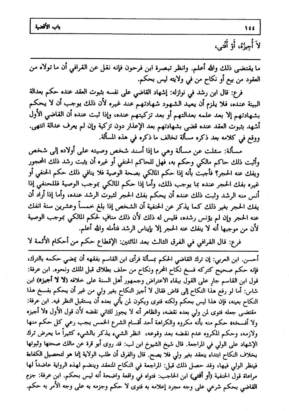 ما يقتضي ذلك، والله أعلم. وانظر تبصرة ابن فرحون فإنه نقل عن القرافي أن ما تولاه من العقود من بيع أو نكاح من في ولايته ليس بحكم.