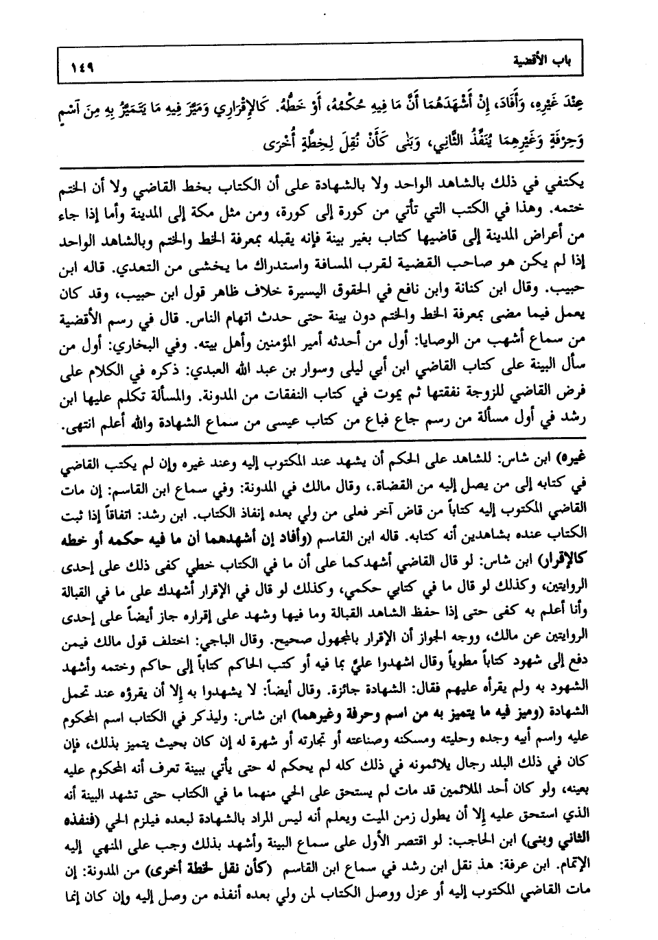 يكتفى في ذلك بالشاهد الواحد ولا بالشهادة على أن الكتاب بخط القاضي ولا أن الختم ختمه وهذا في الكتب التي تأتي من كورة إلى كورة ومن مثل مكة إلى المدينة وأما إذا جاء من أعراض المدينة إلى قاضيها كتاب بغير بينة فإنه يقبله بمعرفة الخط والختم وبالشاهد الواحد إذا لم يكن هو صاحب القضية لقرب المسافة واستدراك ما يخشى من التعدي، قاله ابن حبيب، وقال ابن كنانة وابن نافع في الحقوق اليسيرة خلاف، ظاهر قول ابن حبيب وقد كان يعمل فيما مضى بمعرفة الخط والختم دون بينة حتى حدث اتهام الناس، قال في رسم الأقضية من سماع أشهب من الوصايا: أول من أحدثه أمير المؤمنين وأهل بيته وفي البخاري أول من سأل البينة على كتاب القاضي ابن أبي ليلى وسوار بن عبد الله العبدي ذكره في الكلام على فرض القاضي للزوجة نفقتها ثم يموت في كتاب النفقات من المدونة، والمسألة تكلم عليها ابن رشد في أول مسألة من رسم جاع فباع من كتاب عيسى من سماع الشهادة، والله أعلم، انتهى.