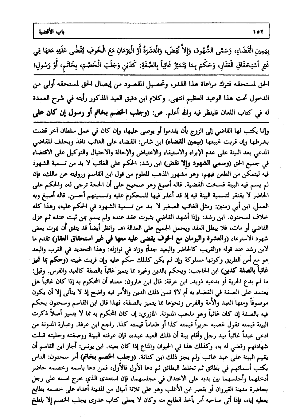 الحق لمستحقه، فترك مراعاة هذا القدر وتحصيل المقصود من إيصال الحق لمستحقه أولى من الدخول تحت هذا الوعيد العظيم، انتهى. وكلام ابن دقيق العيد المذكور رأيته في شرح العمدة له في كتاب اللعان فلينظر فيه، والله أعلم. ص: (وجلب الخصم بخاتم أو رسول إن كان على