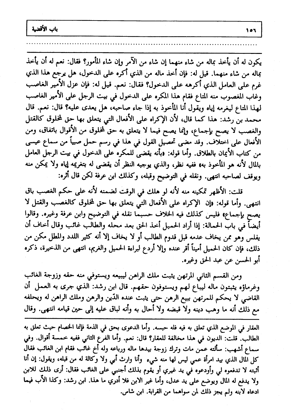 قلت: الأظهر تمكينه منه؛ لأنه لو هلك في الوقت لضمنه؛ لأنه على حكم الغصب باق، انتهى. وأما قوله: "إن الإكراه على الأفعال التي يتعلق بها حق لمخلوق كالغصب والقتل لا يصح بإجماع" فليس كذلك بل فيه الخلاف حسبما نقله في التوضيح وابن عرفة وغيره وقالوا أيضا في باب الحمالة إذا أراد الحميل أخذ الحق بعد محله والطالب غائب وقال: أخاف أن يفلس وهو ممن يخاف عدمه قبل قدوم الطالب أو لا يخاف إلا أنه كثير اللدد والمطل مكن من ذلك فإن كان الحميل أمينا أقر عنده وإلا أردع لبراءة الحميل والغريم، انتهى. من الذخيرة وذكره أبو الحسن عن عبد الحق وغيره. ومن القسم الثاني المرتهن يثبت ملك الراهن ليبيعه ويستوفي منه حقه، وزوجة الغائب وغرماؤه يثبتون ماله ليباع لهم ويستوفون حقهم، قال ابن رشد: الذي جرى به العمل أن القاضي لا يحكم للمرتهن ببيع الرهن حتى يثبت عنده الدين والرهن وملك الراهن له ويحلفه مع ذلك أنه ما وهب دينه ولا قبضه ولا أحال به وأنه لباق عليه إلى حين قيامه، انتهى. وقال