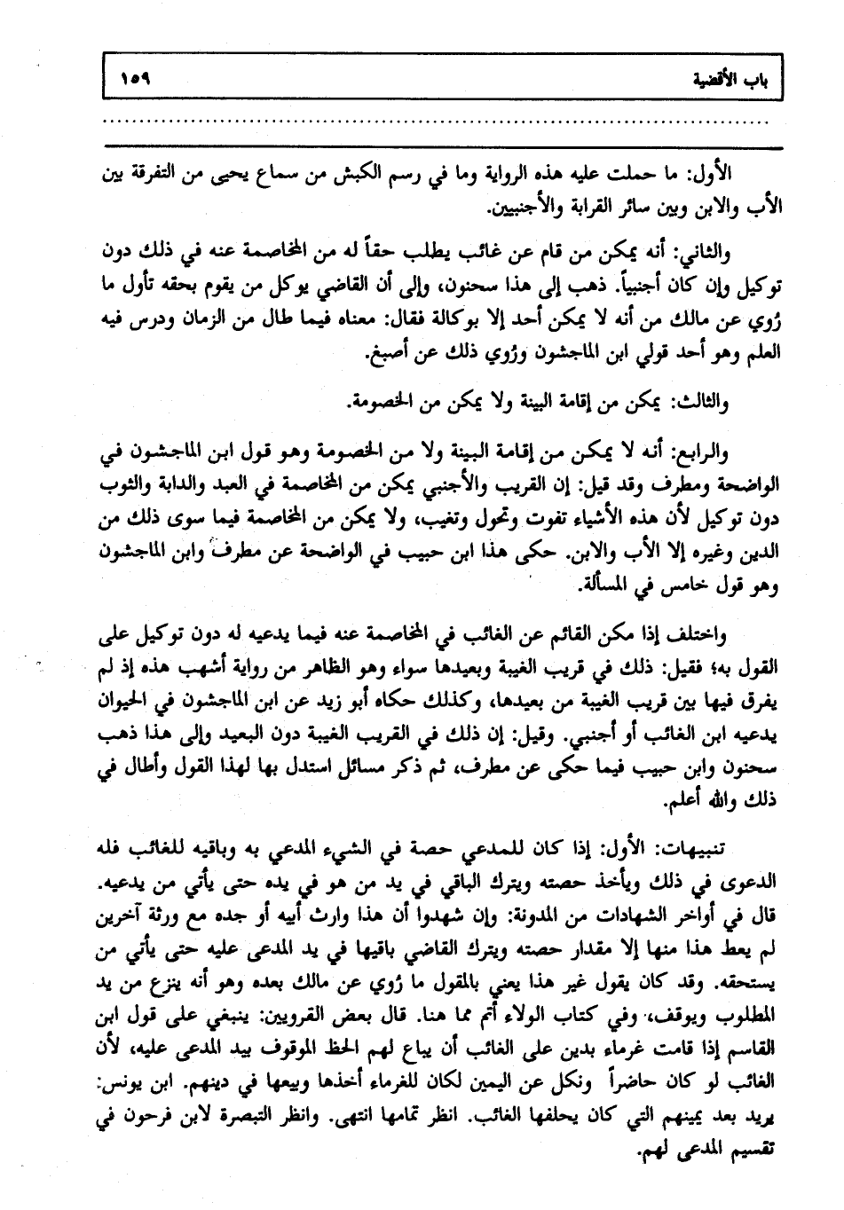 تنبيهات: الأول: إذا كان للمدعي حصة في الشيء المدعى به وباقيه للغائب فله الدعوى في ذلك ويأخذ حصته ويترك الباقي في يد من هو في يده حتى يأتي من يدعيه، قال في أواخر الشهادات من المدونة: وإن شهدوا أن هذا وارث أبيه أو جده مع ورثة آخرين لم يعط هذا منها إلا مقدار حصته ويترك القاضي باقيها في يد المدعى عليه حتى يأتي من يستحقه وقد كان يقول غير هذا يعني بالمقول ما روي عن مالك بعده وهو أنه ينزع من يد المطلوب ويوقف وفي كتاب الولاء أتم مما هنا، قال بعض القرويين: ينبغي على قول ابن القاسم إذا قامت غرماء بدين على الغائب أن يباع لهم الحظ الموقوف بيد المدعى عليه؛ لأن الغائب لو كان حاضرا ونكل عن اليمين لكان للغرماء أخذها وبيعها في دينهم. ابن يونس: يريد بعد يمينهم التي كان يحلفها الغائب انظر تمامها، انتهى. وانظر التبصرة لابن فرحون في تقسيم المدعى لهم