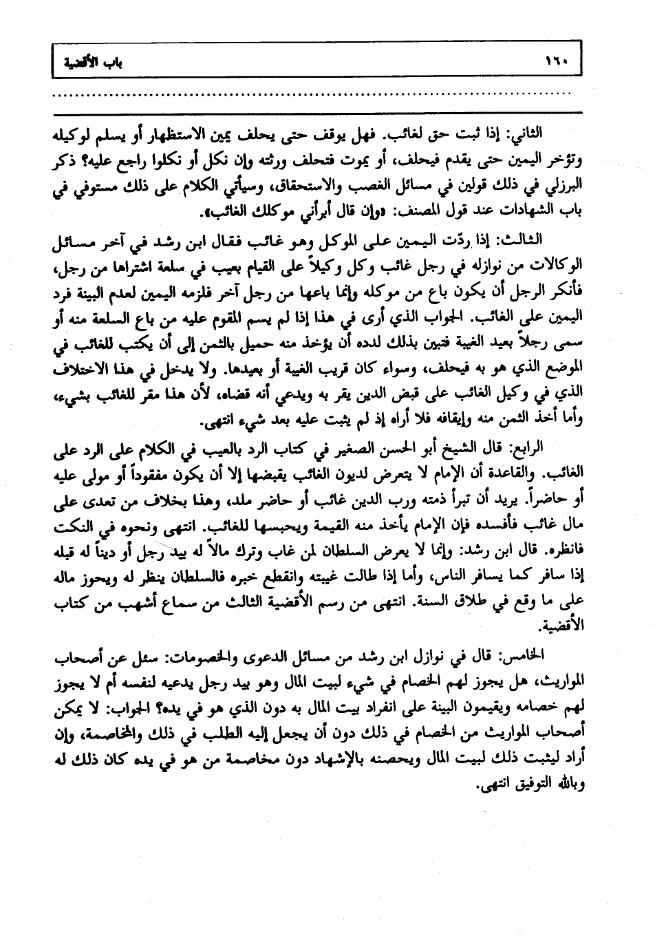 الخامس: قال في نوازل ابن رشد من مسائل الدعوى والخصومات: سئل عن أصحاب المواريث هل يجوز لهم الخصام في شيء لبيت المال وهو بيد رجل يدعيه لنفسه أم لا يجوز لهم خصامه ويقيمون البينة على انفراد بيت المال به دون الذي هو في يده، الجواب لا يمكن أصحاب المواريث من الخصام في ذلك دون أن يجعل إليه الطلب في ذلك والمخاصمة وإن أراد ليثبت ذلك لبيت المال ويحصنه بالإشهاد دون مخاصمة من هو في يده كان ذلك له، وبالله التوفيق، انتهى.