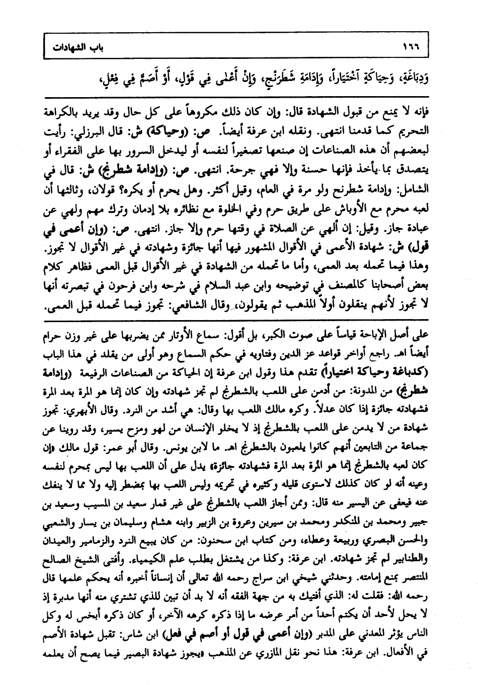 فإنه لا يمنع من قبول الشهادة قال: وإن كان ذلك مكروها على كل حال وقد يريد بالكراهة التحريم كما قدمنا انتهى ونقله ابن عرفة أيضا. ص: (وحياكة) ش: قال البرزلي: رأيت لبعضهم أن هذه الصناعات إن صنعها تصغيرا لنفسه أو ليدخل السرور بها على الفقراء أو يتصدق بما يأخذ فإنها حسنة وإلا فهي جرحة انتهى. ص: (وإدامة شطرنج) ش: قال في الشامل: وإدامة شطرنج ولو مرة في العام وقيل أكثر وهل يحرم أو يكره؟ قولان وثالثهما: أن لعبه محرم مع الأوباش على طريق حرم، وفي الخلوة مع نظائرها بلا إدمان وترك مهم ولهي عن عبادة جاز وقيل: إن ألهى عن الصلاة في وقتها حرم وإلا جاز انتهى. ص: (وإن أعمى في قول) ش: شهادة الأعمى في الأقوال المشهور فيها أنها جائزة وشهادته في غير الأقوال لا تجوز وهذا فيما تحمله بعد العمى وأما ما تحمله من الشهادة في غير الأقوال قبل العمى فظاهر كلام بعض أصحابنا كالمصنف في توضيحه وابن عبد السلام في شرحه وابن فرحون في تبصرته أنها لا تجوز؛ لأنهم ينقلون أولا المذهب ثم يقولون: وقال الشافعي: تجوز فيما تحمله قبل العمى،