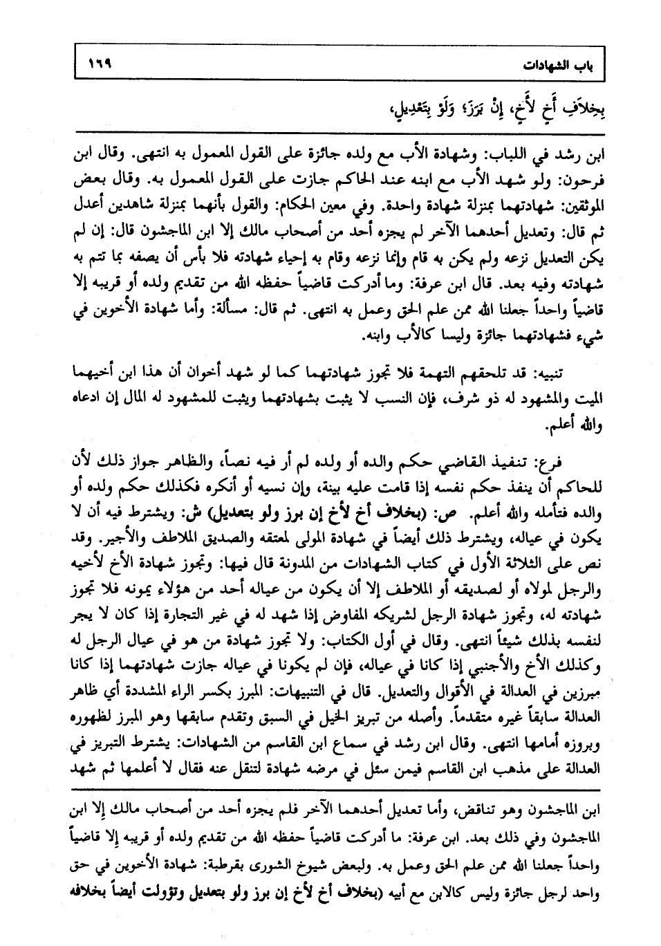 فرع: تنفيذ القاضي حكم والده أو ولده لم أر فيه نصا والظاهر جواز ذلك؛ لأن للحاكم أن ينفذ حكم نفسه إذا قامت عليه بينة وإن نسيه أو أنكره فكذلك حكم ولده أو والده فتأمله والله أعلم. (بخلاف أخ لأخ إن برز ولو بتعديل) ش: ويشترط فيه أن لا يكون في عياله ويشترط ذلك أيضا في شهادة المولى لمعتقه والصديق الملاطف والأجير وقد نص على الثلاثة الأول في كتاب الشهادات من المدونة قال فيها: وتجوز شهادة الأخ لأخيه والرجل لمولاه أو لصديقه أو الملاطف إلا أن يكون من عياله أحد من هؤلاء يمونه فلا تجوز شهادته له وتجوز شهادة الرجل لشريكه المفاوض إذا شهد له في غير التجارة إذا كان لا يجر لنفسه بذلك شيئا انتهى. وقال في أول الكتاب: ولا تجوز شهادة من هو في عيال الرجل له وكذلك الأخ والأجنبي إذا كانا في عياله فإن لم يكونا في عياله جازت شهادتهما إذا كانا مبرزين في العدالة في الأقوال والتعديل. قال في التنبيهات: المبرز بكسر الراء المشددة أي ظاهر العدالة سابقا غيره متقدما، وأصله من تبريز الخيل في السبق وتقدم سابقها وهو المبرز لظهوره وبروزه أمامها انتهى. وقال ابن رشد في أول سماع ابن القاسم من الشهادات: يشترط التبريز في العدالة على مذهب ابن القاسم فيمن سئل في مرضه شهادة لتنقل عنه فقال: لا أعلمها، ثم شهد