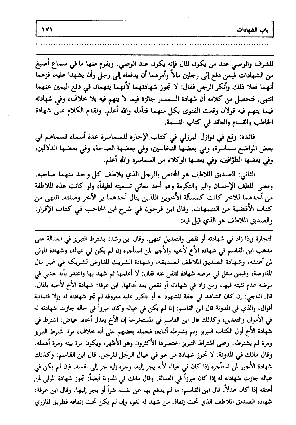 الثاني: الصديق الملاطف هو المختص بالرجل الذي يلاطف كل واحد منهما صاحبه ومعنى اللطف الإحسان والبر والتكرمة وهو أحد معاني تسميته لطيفا ولو كانت هذه الملاطفة من أحدهما للآخر كانت كمسألة الأخوين اللذين ينال أحدهما بر الآخر وصلته انتهى من كتاب الأقضية من التنبيهات، وقال ابن فرحون في شرح ابن الحاجب في كتاب الإقرار: والصديق الملاطف هو الذي قيل فيه: