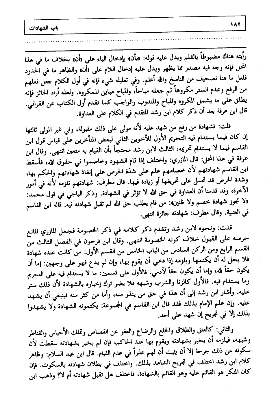 رأيته هناك مضبوطا بالقلم ويدل عليه قوله: "بأن" بإدخال الباء على "أن" بخلاف ما في هذا المحل فإنه وجه فيه مصدر مما يظهر، ويدل عليه إدخال اللام على "أن" والظاهر ما في الحدود فلعل ما هنا تصحيف من الناسخ والله أعلم. وفي تعليله شيء فإنه في أول الكلام جعل فعلهم من الرفع وعدم الستر مكروها ثم جعله مباحا، والمباح مباين للمكروه ولعله أراد الجائز فإنه يطلق على ما يشمل المكروه والمباح والمندوب والواجب كما تقدم أول الكتاب عن القرافي قال ابن عرفة بعد أن ذكر كلام ابن رشد المتقدم في الكلام على العداوة قلت فشهادة من رفع من شهد عليه لأنه مولى على ذلك مقبولة وفي غير المولى ثالثها إن كان فيما يستدام فيه التحريم الأول للأخوين، الثاني لبعض المتأخرين على قياس قول ابن القاسم فيما لا يستدام تحريمه، الثالث لابن رشد محتجا بأن القيام به متعين انتهى. وقال ابن عرفة في هذا المحل: قال المازري: واختلف إذا قام الشهود وخاصموا في حقوق الله فأسقط ابن القاسم شهادتهم؛ لأن خصامهم علم على شدة الحرص على إنفاذ شهادتهم والحكم بها وشدة الحرص قد تحمل على تحريفها أو زيادة فيها قال مطرف: شهادتهم تلزمه؛ لأنه في أمور الآخرة وقد قدمنا أن العداوة في حق الله لا تؤثر في الشهادة وذكر الباجي في قول محمد لا تجوز شهادة خصم ولا ظنين، من قام يطلب حق الله لم تقبل شهادته فيه قاله ابن القاسم في العتبية وقال مطرف: شهادته جائزة انتهى.