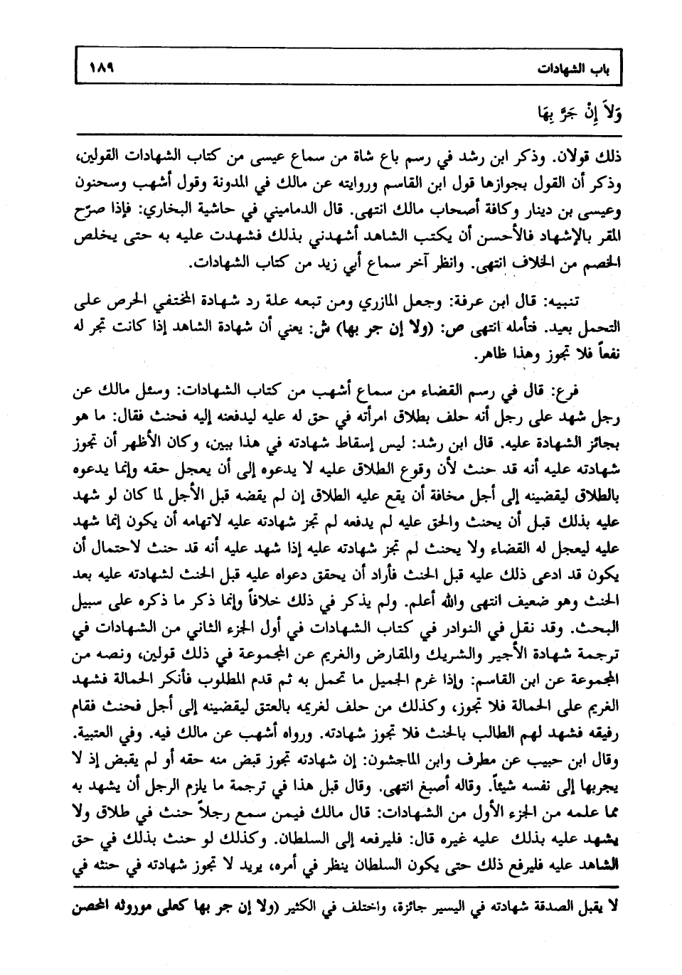 تنبيه: قال ابن عرفة: وجعل المازري ومن تبعه علة رد شهادة المختفي الحرص على التحمل بعيد فتأمله انتهى. ص: (ولا إن جر بها) ش: يعني أن شهادة الشاهد إذا كانت تجر له نفعا فلا تجوز وهذا ظاهر.