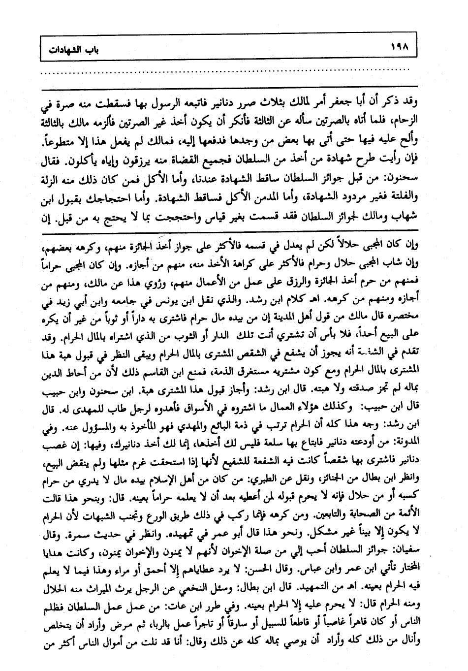 وقد ذكر أن أبا جعفر أمر لمالك بثلاث صرر دنانير فاتبعه الرسول بها فسقطت منه صرة في الزحام فلما أتاه بالصرتين سأله عن الثالثة فأنكر أن يكون أخذ غير الصرتين فألزمه مالك بالثالثة وألح عليه فيها حتى أتى بها بعض من وجدها فدفعها إليه، فمالك لم يفعل هذا إلا متطوعا فإن رأيت طرح شهادة من أخذ من السلطان فجميع القضاة منه يرزقون وإياه يأكلون، فقال سحنون: من قبل جوائز السلطان ساقط الشهادة عندنا وأما الأكل فمن كان ذلك منه الزلة والفلتة فغير مردود الشهادة وأما المدمن الأكل فساقط الشهادة، وأما احتجاجك بقبول ابن شهاب ومالك لجوائز السلطان فقد قست بغير قياس واحتججت بما لا يحتج به من قبل أن