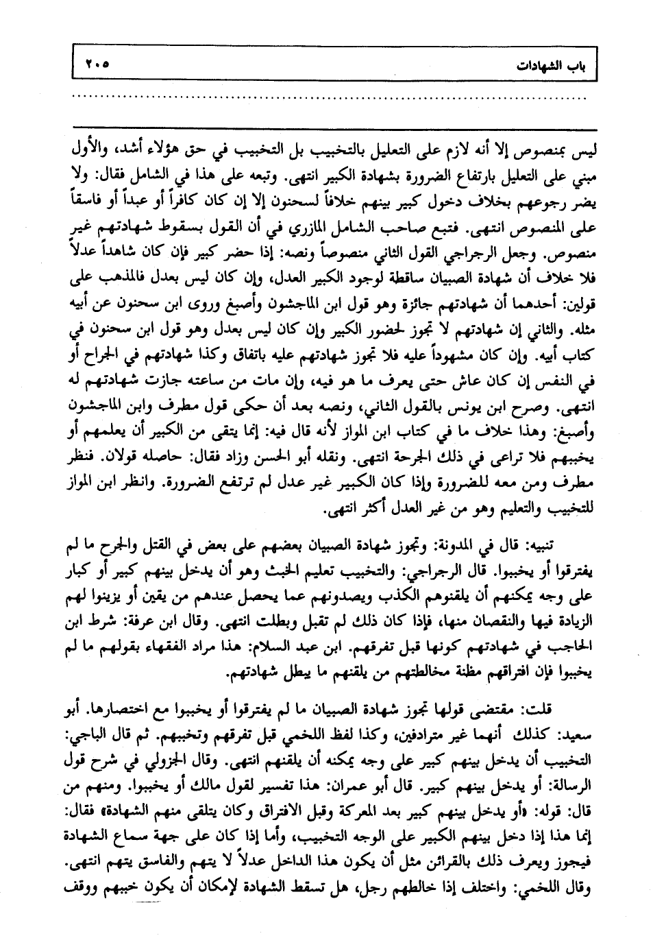 ليس بمنصوص إلا أنه لازم على التعليل بالتخبيب بل التخبيب في حق هؤلاء أشد والأول مبني على التعليل بارتفاع الضرورة بشهادة الكبير انتهى. وتبعه على هذا في الشامل فقال: ولا يضر رجوعهم بخلاف دخول كبير بينهم خلافا لسحنون إلا إن كان كافرا أو عبدا أو فاسقا على المنصوص انتهى. فتبع صاحب الشامل المازري في أن القول بسقوط شهادتهم غير منصوص وجعل الرجراجي القول الثاني منصوصا، ونصه: إذا حضر كبير فإن كان شاهدا عدلا فلا خلاف أن شهادة الصبيان ساقطة لوجود الكبير العدل، وإن كان ليس بعدل فالمذهب على قولين: